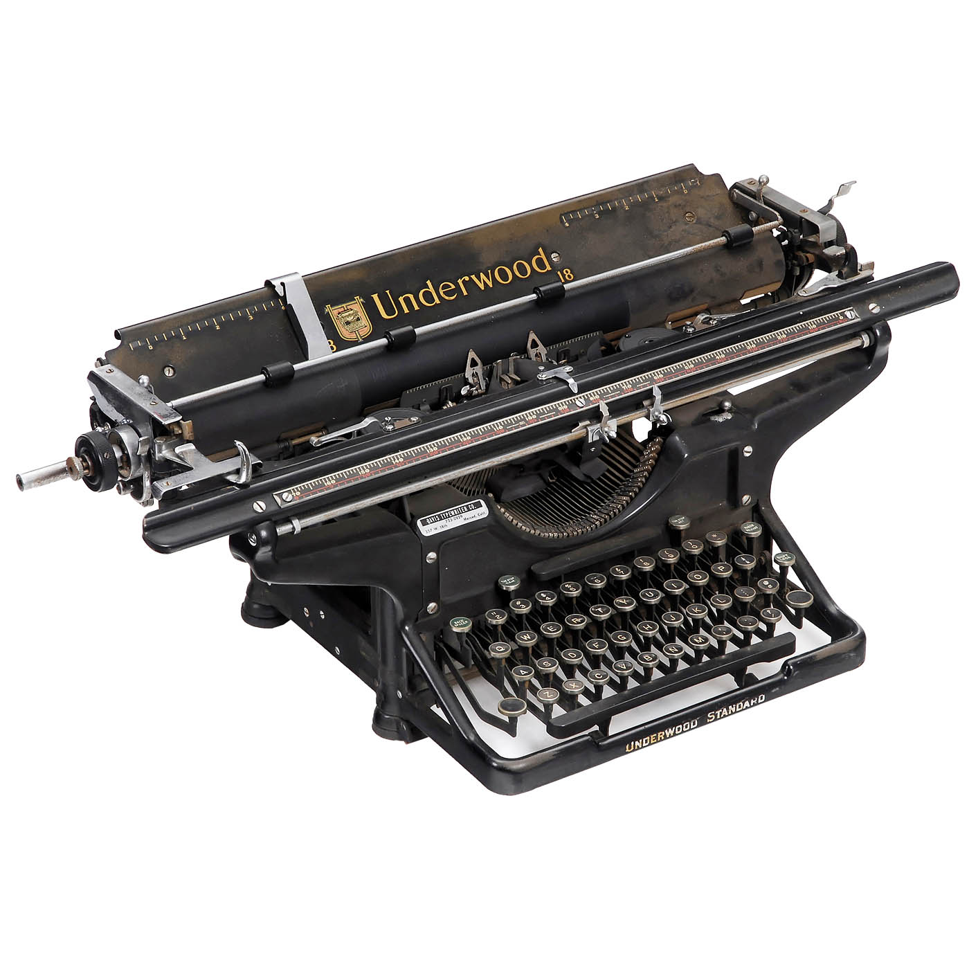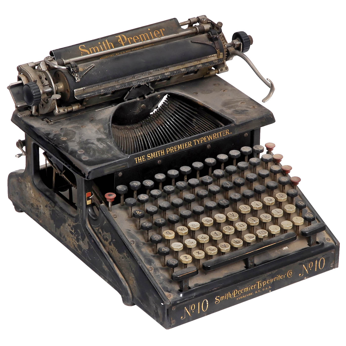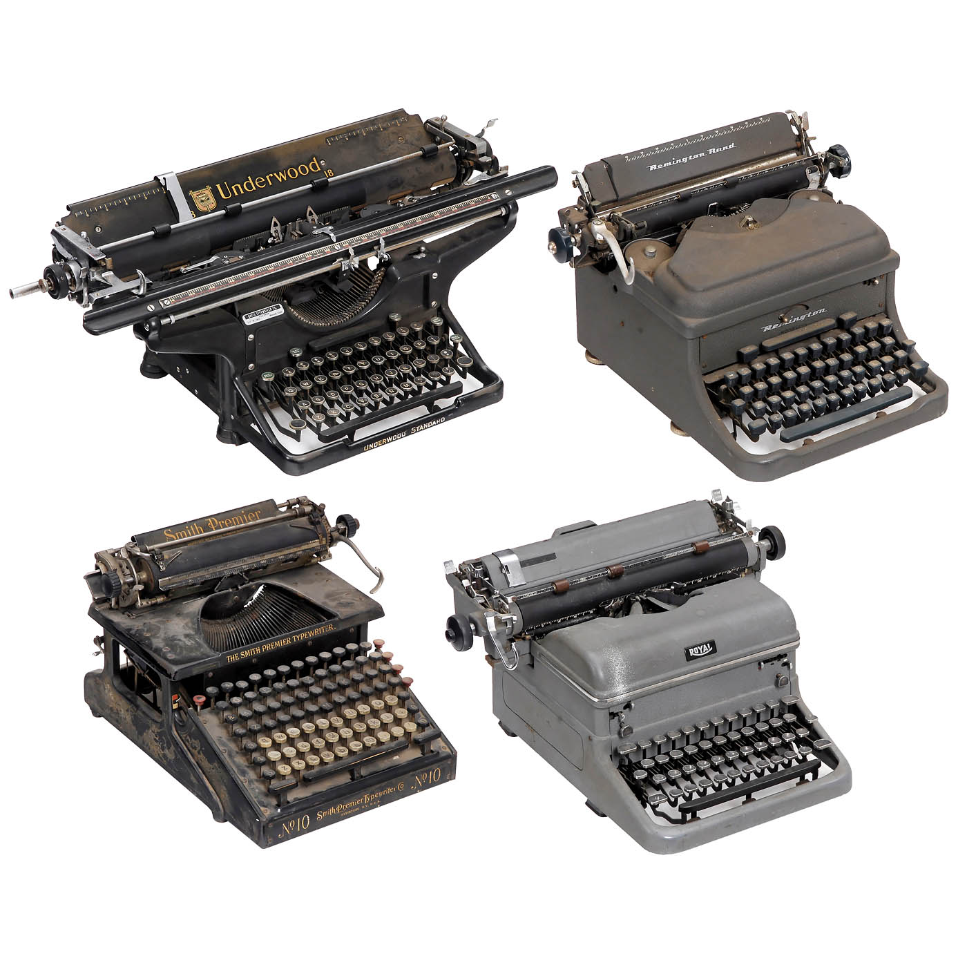 1) "Underwood Standard No. 6", 1936, serial no. 4472121, with extra-wide carriage, tabulator, in need of cleaning. (3/4) - 2) "Royal KMG", c. 1949, with patented Magic Margin construction, "tombstone-style" design keys, works. (3/3-) - 3) "Remington Noiseless", c. 1950, thrust-action machine, in need of cleaning and oiling. (3-4/4-5) - And: 4) "Smith Premier No. 10", c. 1910, Smith-Premier Typewriter Company, Syracuse, full keyboard, front-stroke, defective. (3-4/4-5)