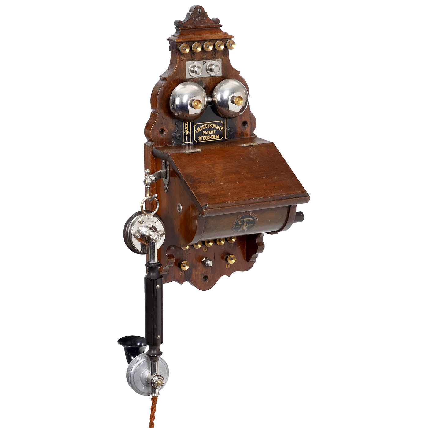 No. 518044, L.M. Ericsson, Stockholm, Sweden, walnut case, attractive Ericsson transfer, writing slope, handset with speaking horn, 2-part crank inductor, double bell, good condition.