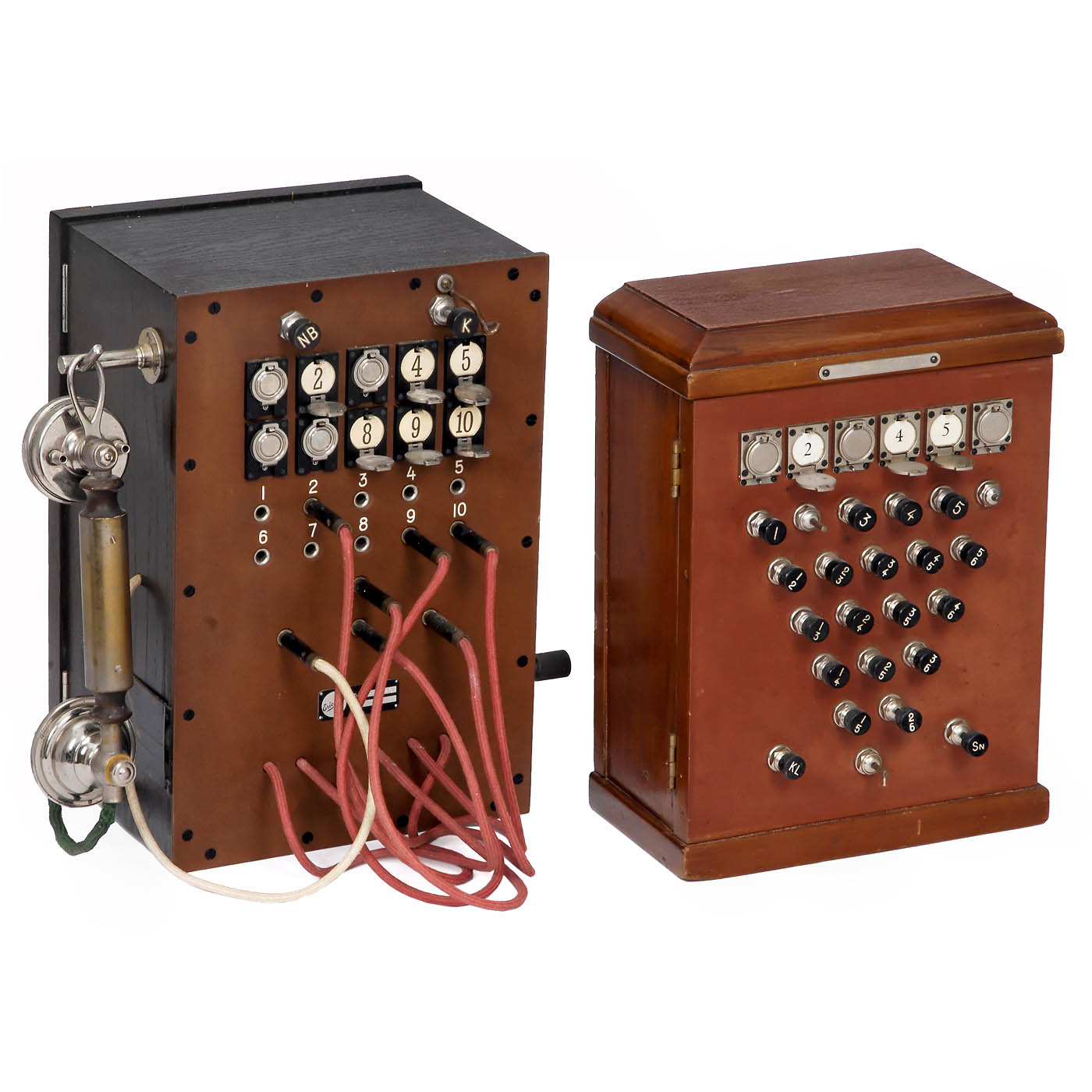 1) Wall station ABH 1210, L.M. Ericsson, Stockholm, ten flaps, seven plugs, crank inductor, handset with intercom button. - 2) Desk station, Televerkstäderna, with dial and ten push buttons. - 3) Wall station, Emil Møller, pyramidal arrangement, six flaps, twenty-two push buttons (two caps missing). - And: 4) Desk station LP 10, Telegraf Verkstad, with switches and plugs, bakelite handset.