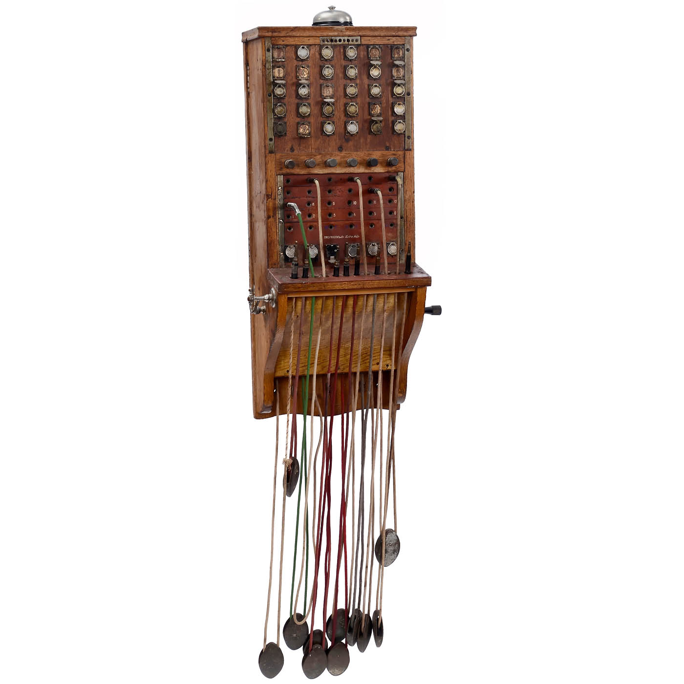 Wall-type for 30 flaps, with twelve plugs and weights, bell with night switch, crank inductor, missing handset, oak case, height 29 ½ in., with Cyrillic inscription.