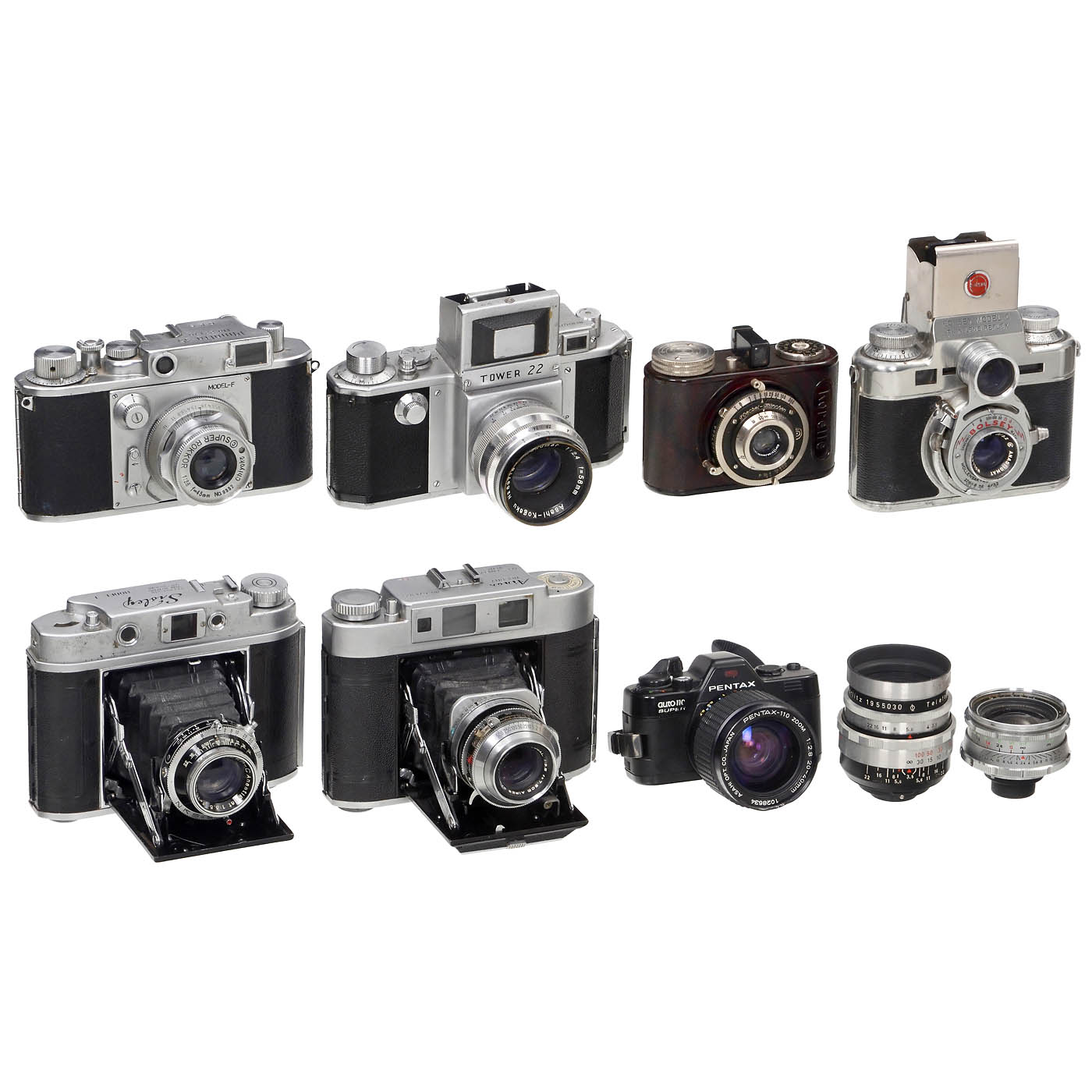 1) Minolta-35 Model-F, with Super Rokkor 2.8/45 mm. (3/-) - 2) Tower-22, M42 SLR with Asahi-Kogaku Takumar 2.4/58 mm. (3/3) - 3) Korelle, front dark-red plastic, back in black, with Tessar 3.5/3.5 cm. (3/-) - 4) Bolsey Model C Twin Lens Reflex, telephone number scratched onto the reverse. (4/-) - 5) Aires Viceroy, 6 x 6 cm. (3/3-) - 6) Sisley Model-1, 6 x 6 cm. (3-/3-) - 7) Pentax 110 auto, with Zoom 2.8/20-40 mm, dent on front. (3/-) - And: 8-9) Telefogar 3.5/90 for Altix and Agfa Color-Ambion 3.4/35 for Ambiflex. (3/3)