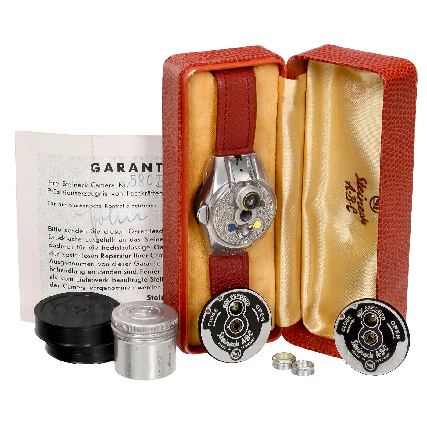 Steineck, Pappenheim, Germany. With Steinheil 2.5/12.5 mm lens, red leather watch strap, red presentation box and original Steineck accessories: guarantee card for this camera no. 580B, yellow filter, circular films in Steineck aluminum case and 2 film cassettes in Steineck plastic cases, overall excellent condition. A rare outfit!