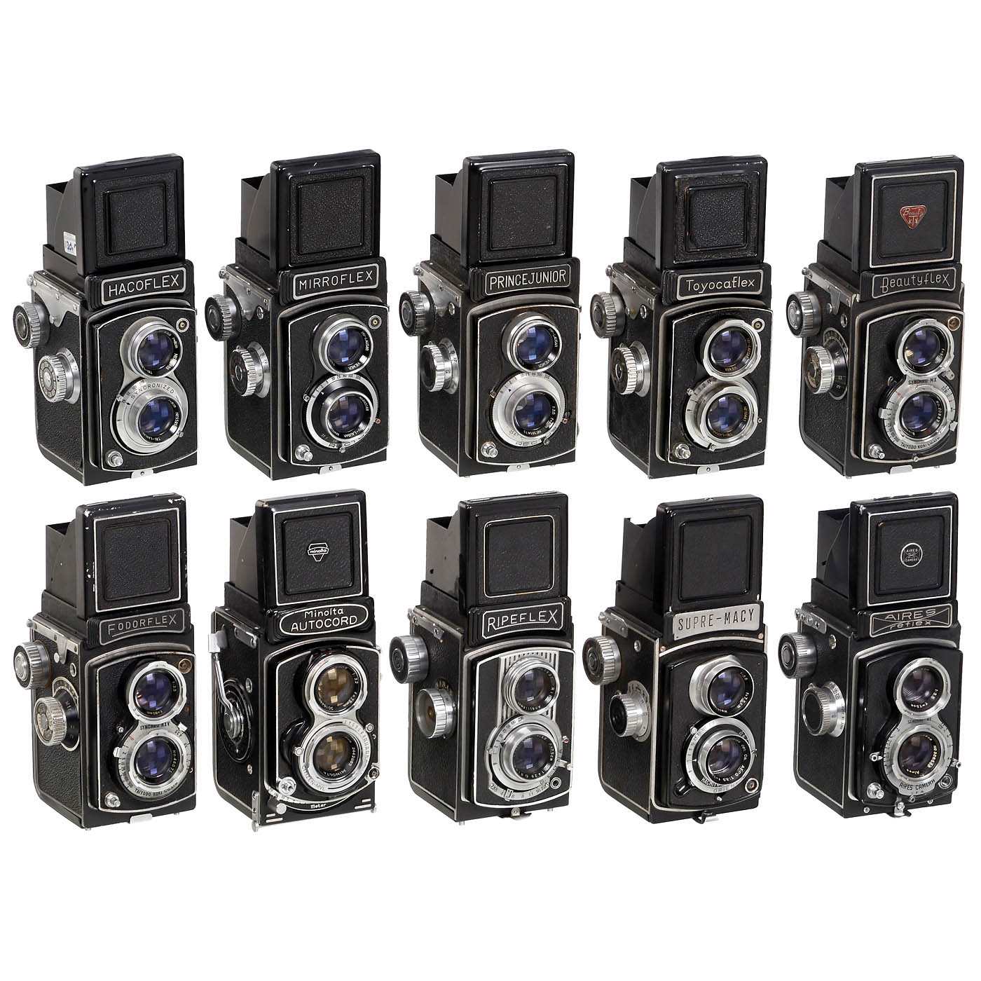 1-4) Nearly identical versions of Hacoflex, Mirroflex, Prince Junior and Toyocaflex, all with Tri-Lusar 3.5/8 cm, shutters working. (3-/3) - 5-6) Nearly identical versions of Beautyflex and Fodorflex, Biokor 3.5/80 mm, shutters working. (3-/3) - 7) Minolta Autocord, working. (3/3) - 8-9) Ripeflex and Supre-Macy, working. (3-/3) - And: 10) Aires-reflex. (3/-) - Cameras tested for shutter function only.