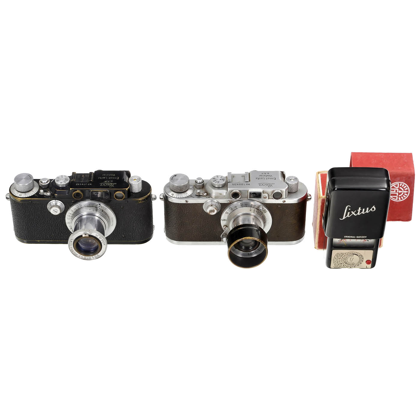 Leitz, Wetzlar. 1) Hektor 2,5/5 cm no. 121332, coated, some fog visible under point light. (3/3) - 2) Leica III, no. 120435, chrome, shutter 1/20-1/500 sec., with Elmar 3,5/50 mm no. 169711 and second version FIKUS hood, shutter works but long times are all the same, rangefinder faintly visible but quite accurate. (3-/3-) - 3) Leica III no. 25897, black, with case, only one shutter curtain movable, rangefinder faintly visible but accurate. (3-4/-) - And: 4) Gossen "Sixtus for the Leica", with box and instructions in German, in working condition. (2-/3)