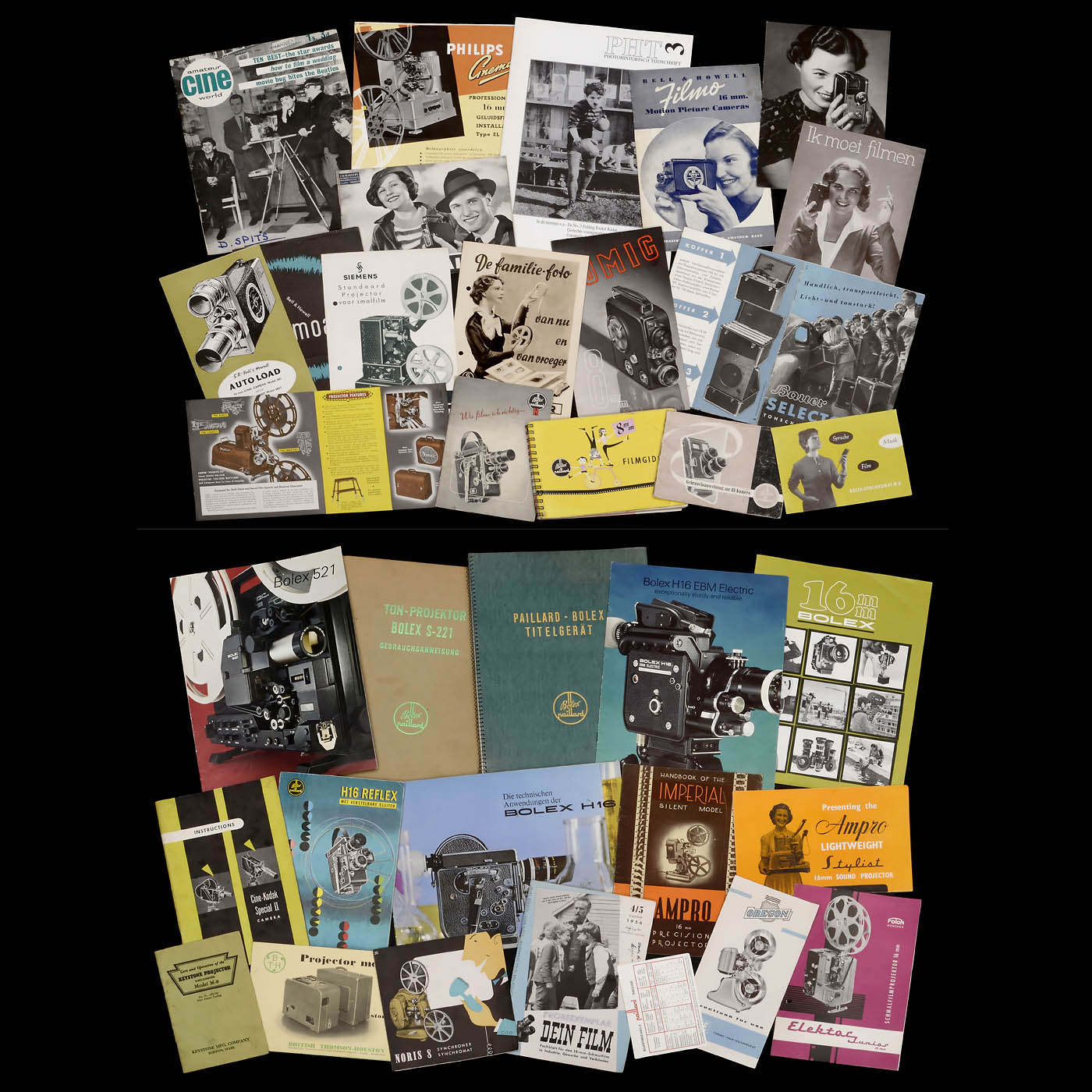 1) A stack of approx. 12 ½ in. (33 cm) of literature on 8 and 16 mm motion picture cameras, projectors and accessories, 1930-1980. - And: 2) Issues of the magazine "8 mm Movie Maker" (1960-1967) and 60 issues of the magazine "Photohistorisch Tijdschrift" (1993-2021).