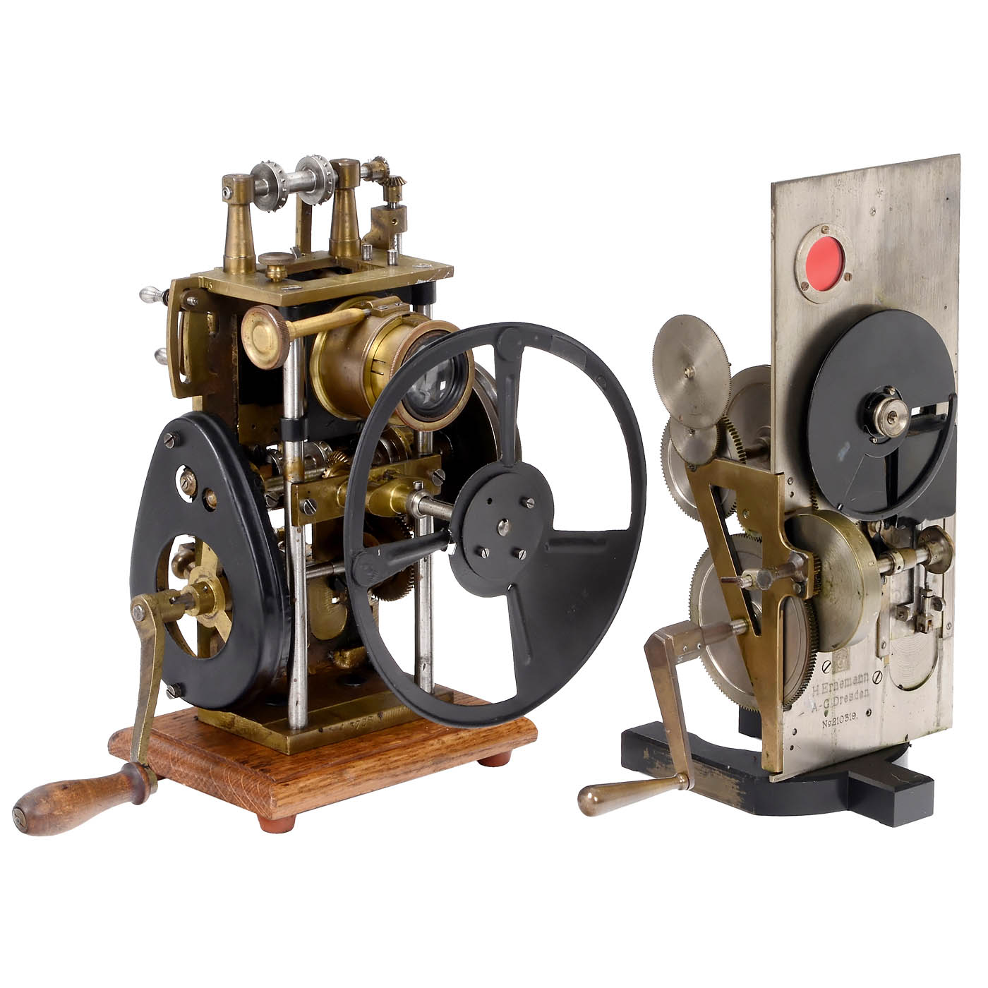 1) Gear-train of an Ernemann film camera with claw and dark sector, with hand-turned mechanism, engraved: "H. Ernemann A.G. Dresden", on metal stand. - And: 2) Stepper mechanism of a Maltese cross film projector with image window, lens and front panel, with hand-turned mechanism, engraved: "L'Educateur" L. Mollier, Paris, on a wood base.