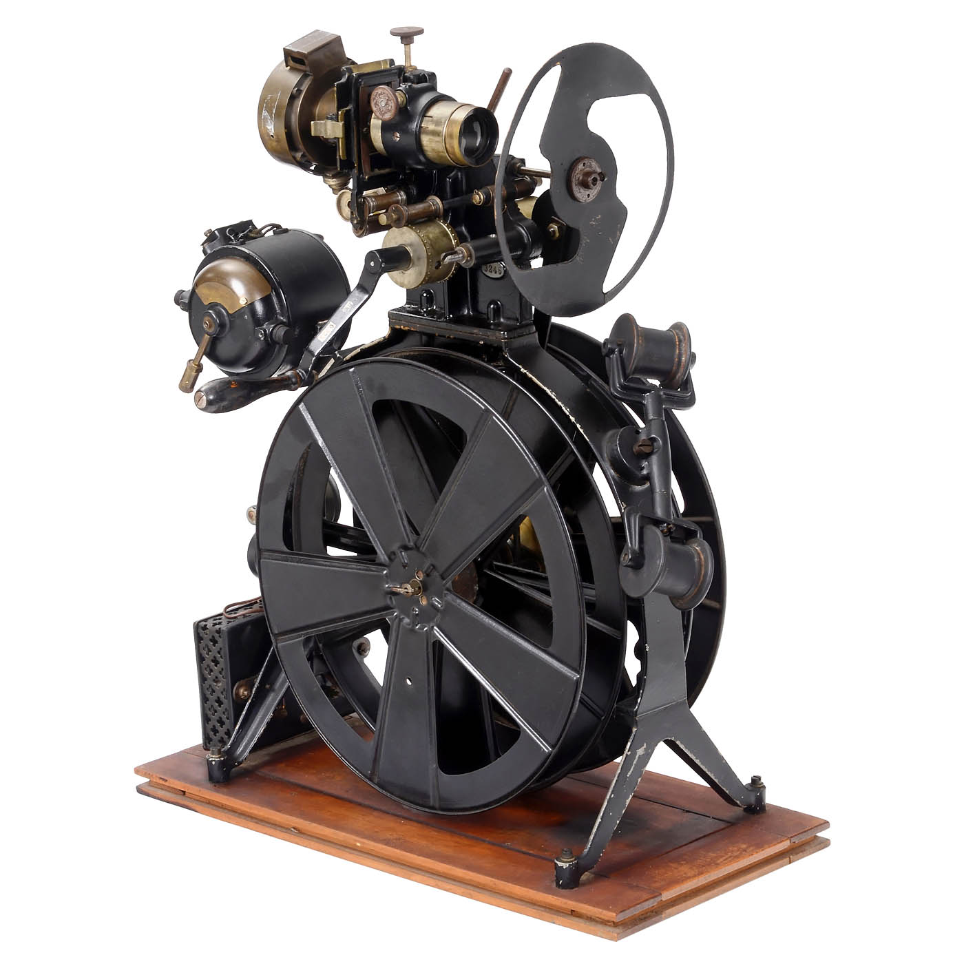 Probably Lehmann & Knetsch, Breslau. Projector for 35mm film, coaxial film spools for 600 meters of film, Maltese cross movement, deflection rollers for the projection of infinite film loops, hand-turned mechanism or motor, lens unknown, transmission sluggish, in need of cleaning and lubricating, electrical functions untested.