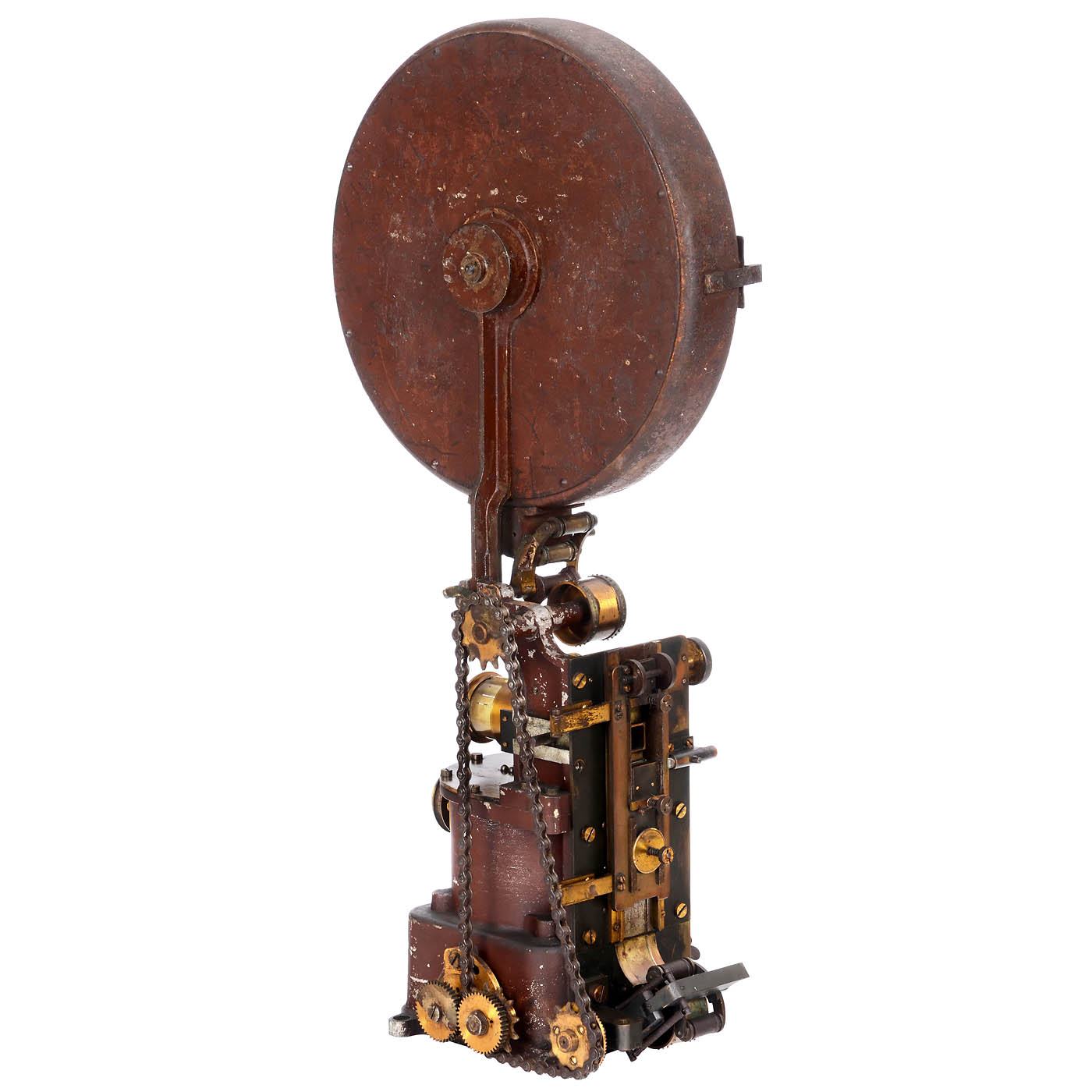 Kineto, London. The core of a 35mm film projector of the silent film era, stepper mechanism with two claws to protect the film perforation, chain transmission to sprockets, image line adjustment by lens shift, lens unknown, gearbox running, front diaphragm not present. - A very rare machine head from the silent film era in Great Britain.