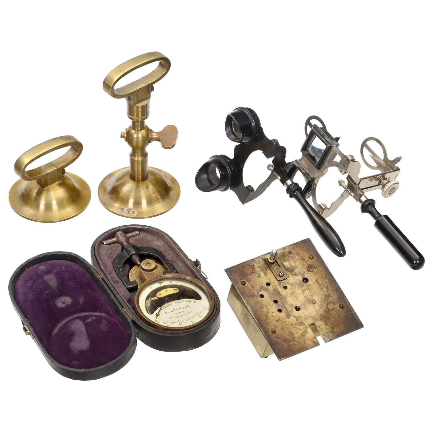 1) Carbon arc lamp, demonstration model by John Browning, London, original lacquered brass, 2 graphite electrodes, one height-adjustable, on wood base, height 14 in. - 2) Diabetometer, marked "Diabétromètre Yvon-Dubosq à Penombres, Paris", historical blood glucose meter, original lacquered brass, length 18 ½ in., in walnut case. - 3) Magdeburg hemispheres, after Otto von Guericke, for demonstrating the effect of air pressure, brass, one bowl with valve. - 4) Circle stencils, D.FC. Fitzgerald, approx. 100 beechwood stencils of various sizes, for architects, in mahogany case. - 5) Gear model, 6 brass gears, engraved "Geo. L. Dickson Inv. 1852 - Lincoln - W. Thomas fecit 1854", hand-turned, walnut frame, height 21 2/3 in. - 6) Early hand blower, brass, with crank. - 7) 2 stereo viewers, France. - 8) Geologist's compass, Tavernier-Gravet, Paris, mahogany case, bearing by prism, instructions stamped on brass plate, screw-head for taking measurements. - And: 9) 3 further measuring instruments and a spring motor.
