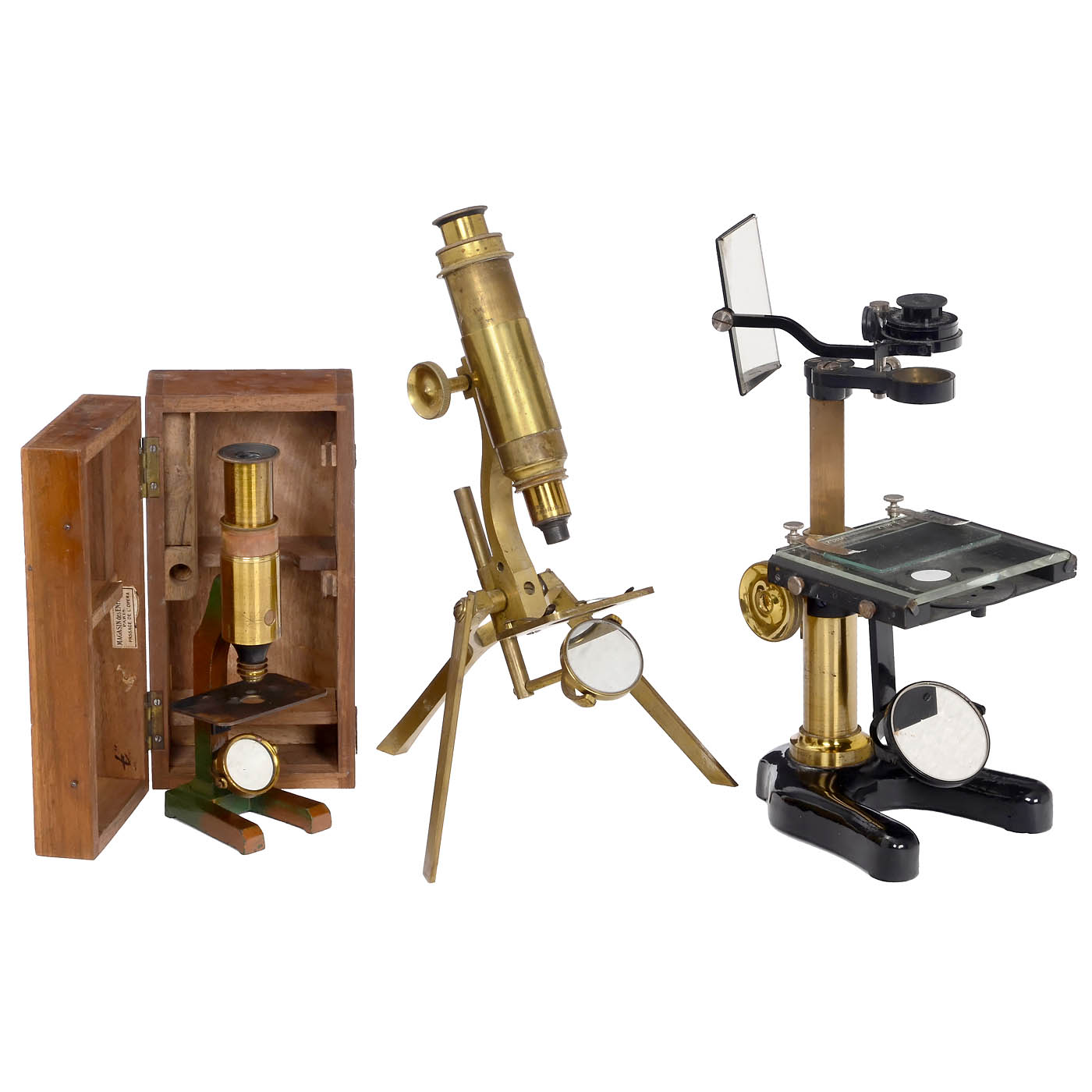 1) Swift & Son, England, c. 1880, original lacquered brass, folding tripod, double mirror, focusing via 2 knurled screws, height 10 in. - 2) Preparation microscope and drawing apparatus by E. Leitz, Wetzlar, c. 1915, of lacquered brass with iron horseshoe base, pinhole diaphragm, rack-and-pinion focusing of the magnifier, retracted height 7 1/2 in. - 3) Education microscope, France, c. 1900, height 7 in., in case. - And: 4) Collection of microscope specimen slides, English, late 19th century, in mahogany case with hinged door opening on 20 drawers.