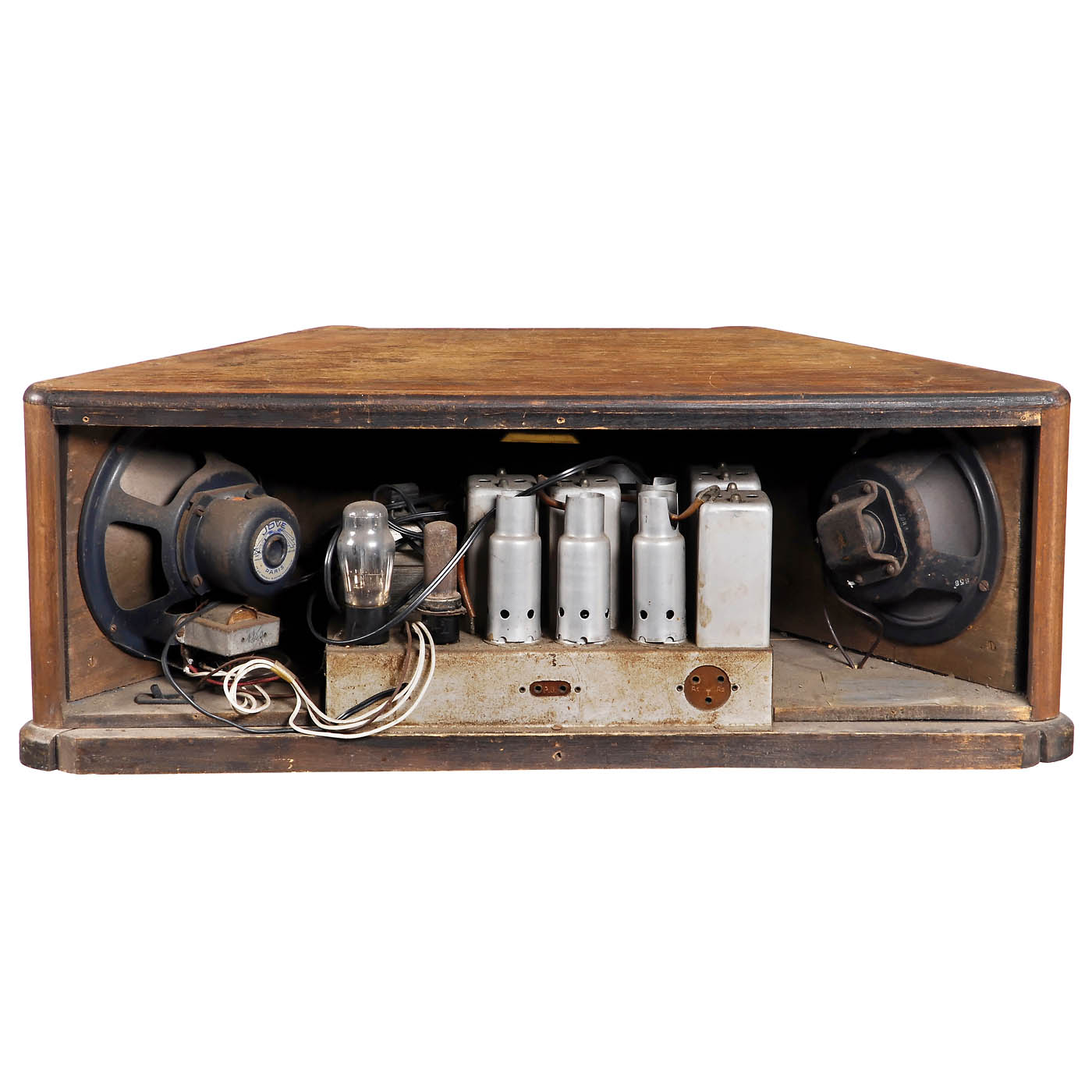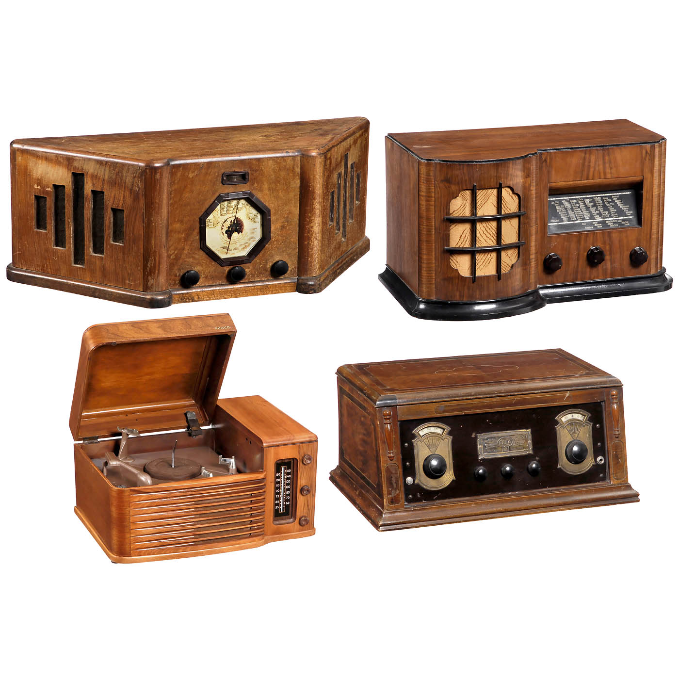 1) Seibt 326 W, c. 1935, Dr. Georg Seibt, Berlin, loudspeaker, chassis with components and rear panel added. - 2) France, c. 1935, manufacturer and model unknown, trapezoidal case, 2 loudspeakers. - 3) Erla Monodic S-50, 1926, Electrical Research Laboratories, USA, 6 tubes, medium wave only, battery-operated, for external speaker, wood case, complete with tubes. - And: 4) Philco, c. 1938, USA, radio with record player, teak case.