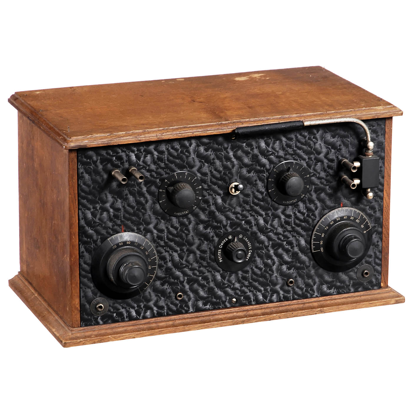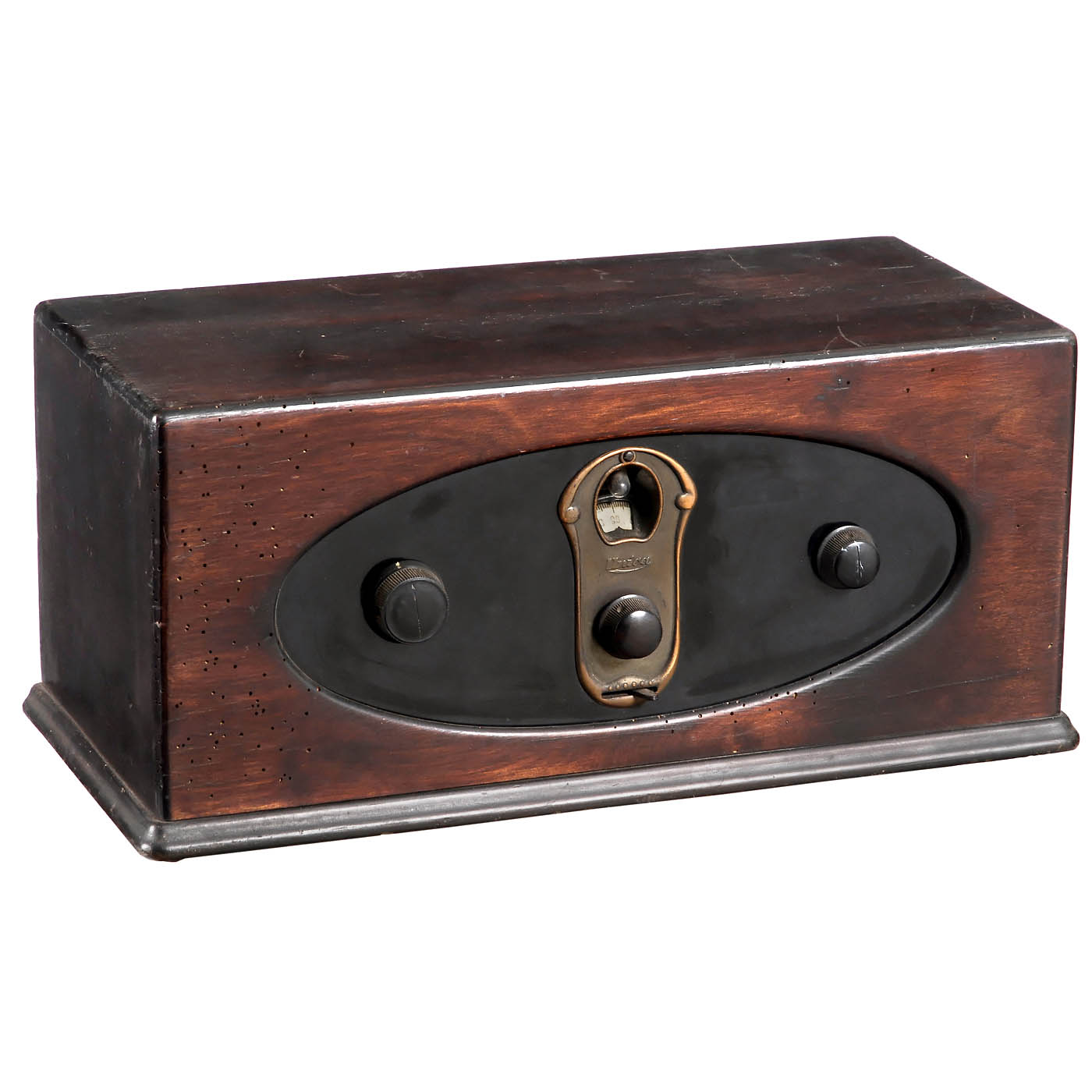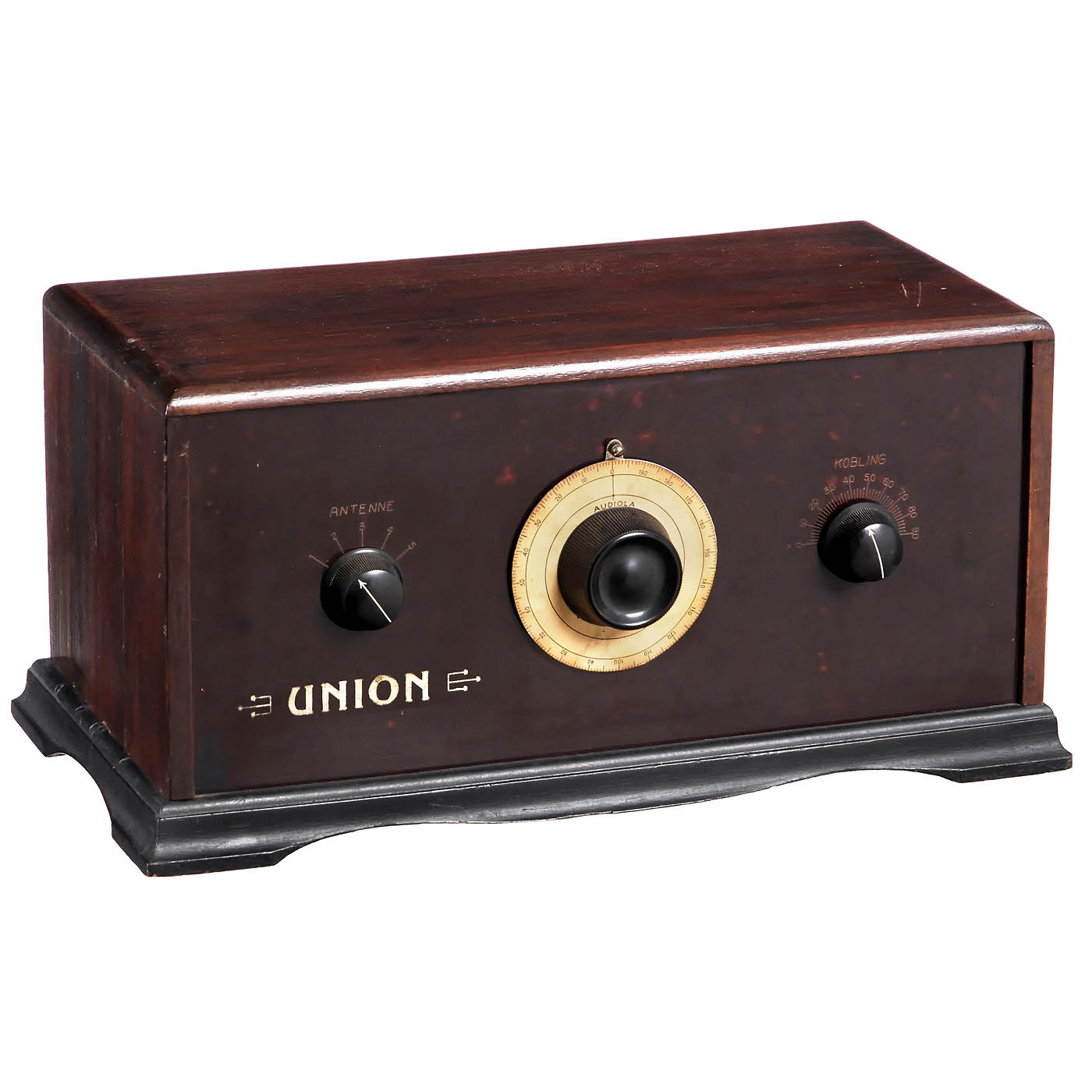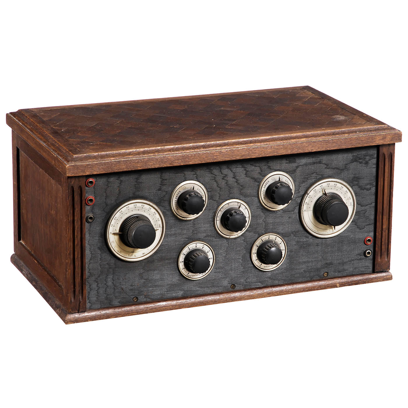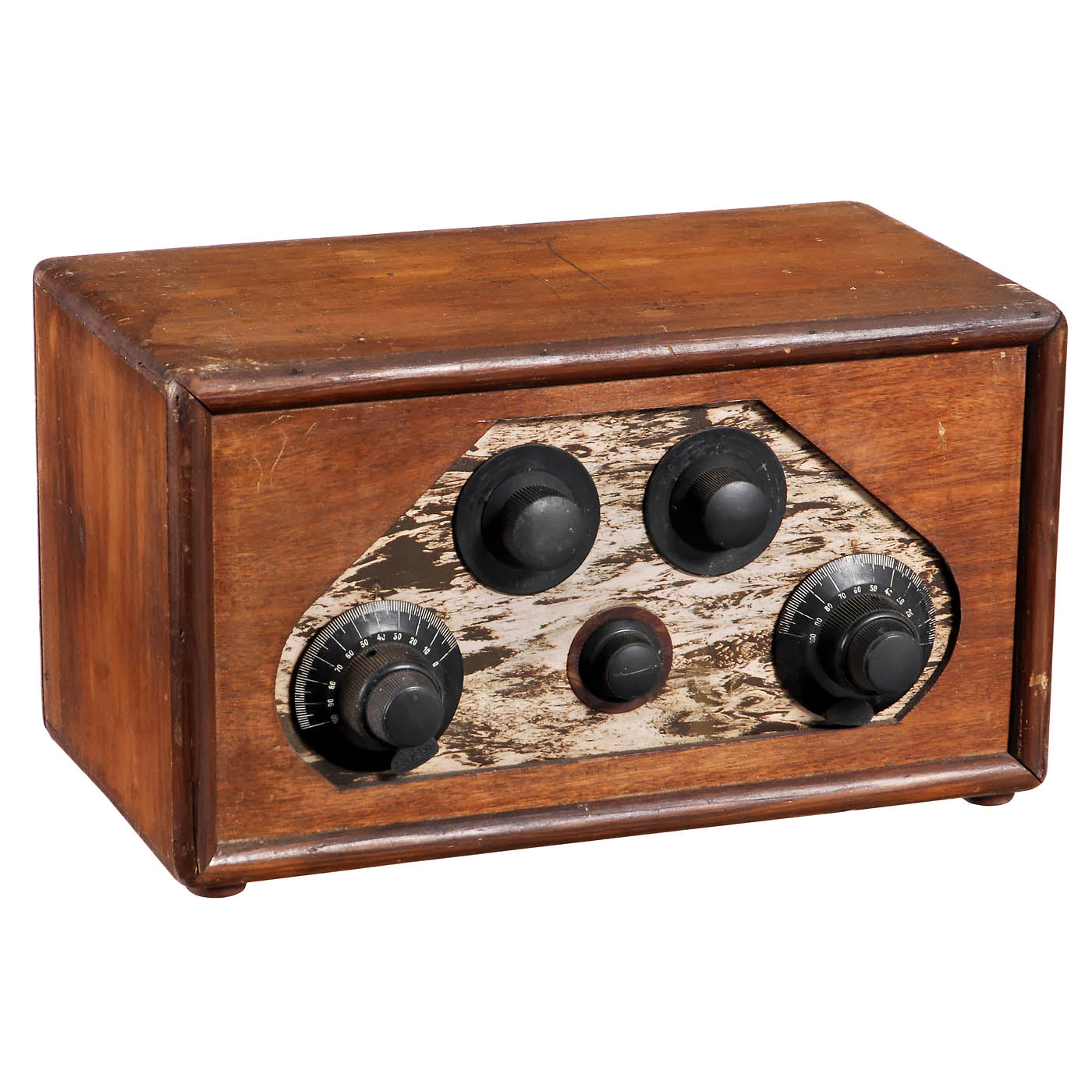1) Unica DJ 40, c. 1935, Denmark, 3 tubes, wood case with wormholes. - 2) Custom-made, c. 1928, 3 tubes, battery operation, oak case. - 3) Custom-made, c. 1928, battery-operated. - 4) Union, c. 1932, Stratofon Denmark, 3 tubes, battery-operated. - 5) Custom-made, c. 1928, 4 tubes, battery operation, oak case. - And: 6) Reality, c. 1933, France, battery-operated.