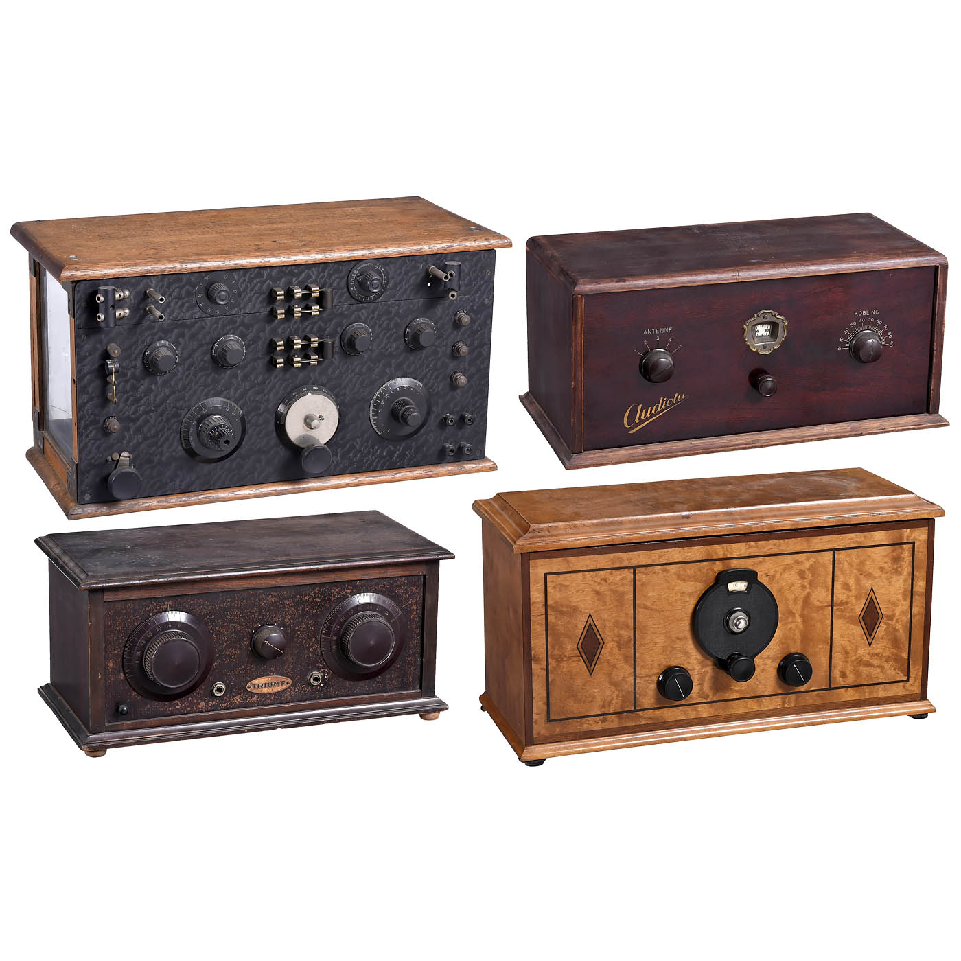 1) Audiola, c. 1930, Nordisk Solar, Denmark, 4 tubes, 220 volts AC, for external speaker. - 2) Unmarked, c. 1928, France, 5 tubes, battery operation, for external loudspeaker, three glazed sides. - 3) Unmarked, c. 1930, 3 tubes, battery-operated, for external loudspeaker, deluxe wood cabinet, inlaid front. - And: 4) Triumf, c. 1930, Denmark, 3 tubes, DC mains operation, medium wave only, for external speaker.