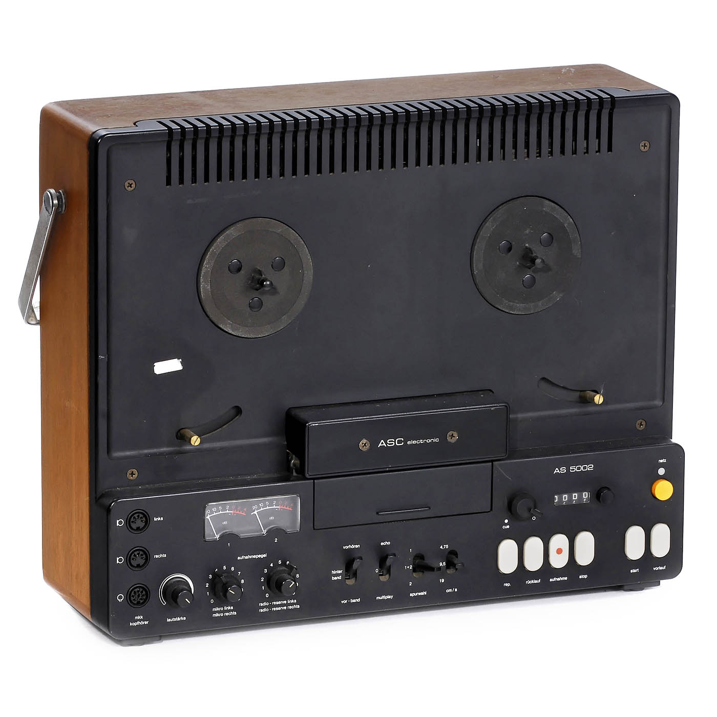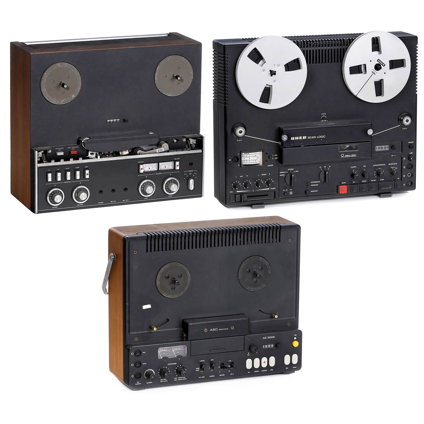 1) "Uher SG 631 Logic", 1977 onwards, Uher Werke Germany, reel-to-reel tape without pressure roller but with specially coated sound shaft (Omega-Drive), 3 tape speeds: 4.75, 9.5 and 19 cm/sec., interchangeable headstock with erase head, slide pilot and separate heads for recording and playback, fully electronic drive with 4 DC motors, DIN and RCA connections, for reels up to 27 cm diameter, 110/220 volts AC. - 2) "Revox A 77 MK IV", 1973 onwards, Willi Studer, Switzerland, tape speeds: 9.5 and 19 cm/sec., 3 Papst motors, 110-250 volts AC. - And: 3) "AS 5002", 1974 onwards, ASC-Electronic, Aschaffenburg, Germany, 3 tape speeds: 4.75, 9.5 and 19 cm/sec., 3 motors, for 18 cm reels, 3 heads, wood case, 220-240 volts AC. - All untested.