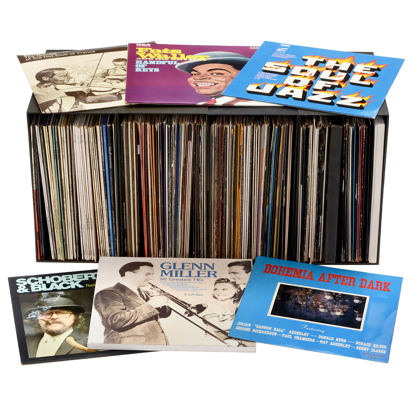 1) 18 Oscar Peterson records, including Digital at Montreux, Night Train, Canadian Suite and Live at the Northsea Jazz Festival. - 2) 5 of Erroll Garner. - 3) 6 Boogie-Woogie records, including Sammy Price, Vince Weber, Axel Zwingenberger and James Booker. - 4) 5 blues records, including Sam Hopkins, Brownie McGhee and Otis Spann. - 5) 3 Marilyn Monroe picture records. - 6) 26 records by Cannonball or Nat Adderley. - 7) 70 miscellaneous jazz records, including Coleman Hawkins, Dizzy Gillespie, Ella Fitzgerald, Glenn Miller, Wild Bill Davis, Jimmy Smith, Jan Voss, Sonny Rollins, Thelonious Monk, Art Blakey, Houston Person, Clifford Brown, Dexter Gordon, The Dutch Swing Collage Band, Django Reinhardt and many more performers. - 8) 10 rock and pop records. - 9) 55 records by German cabaret and entertainment artists, including Die Stachelschweine, Werner Schneyder, Werner Finck and Otto. - And: 10) 46 records with titles played by mechanical musical instruments. - In addition: Philips compact system with record player, radio and amplifier (cassette recorder belt defective) and 2 loudspeakers.