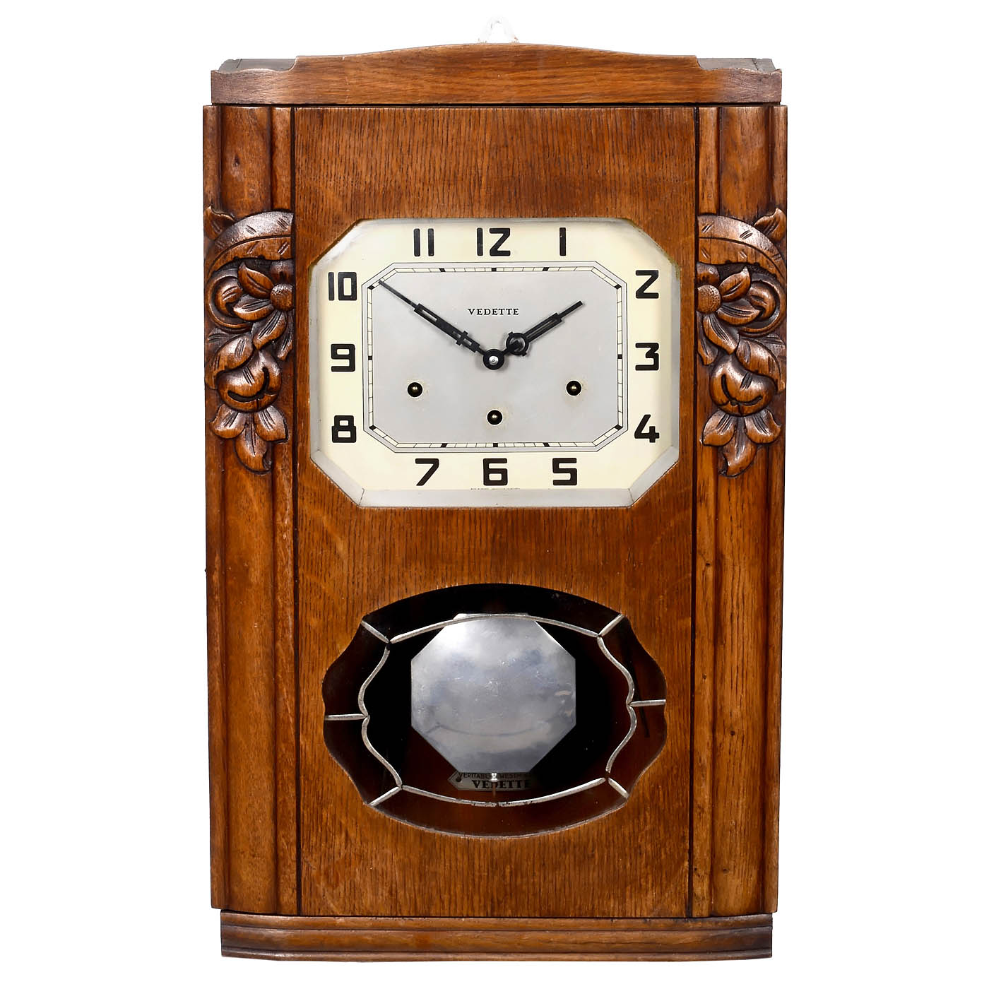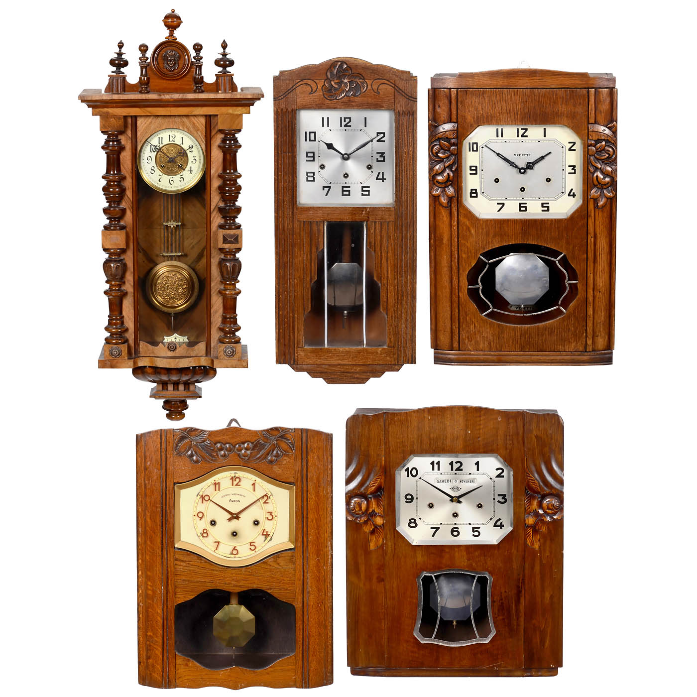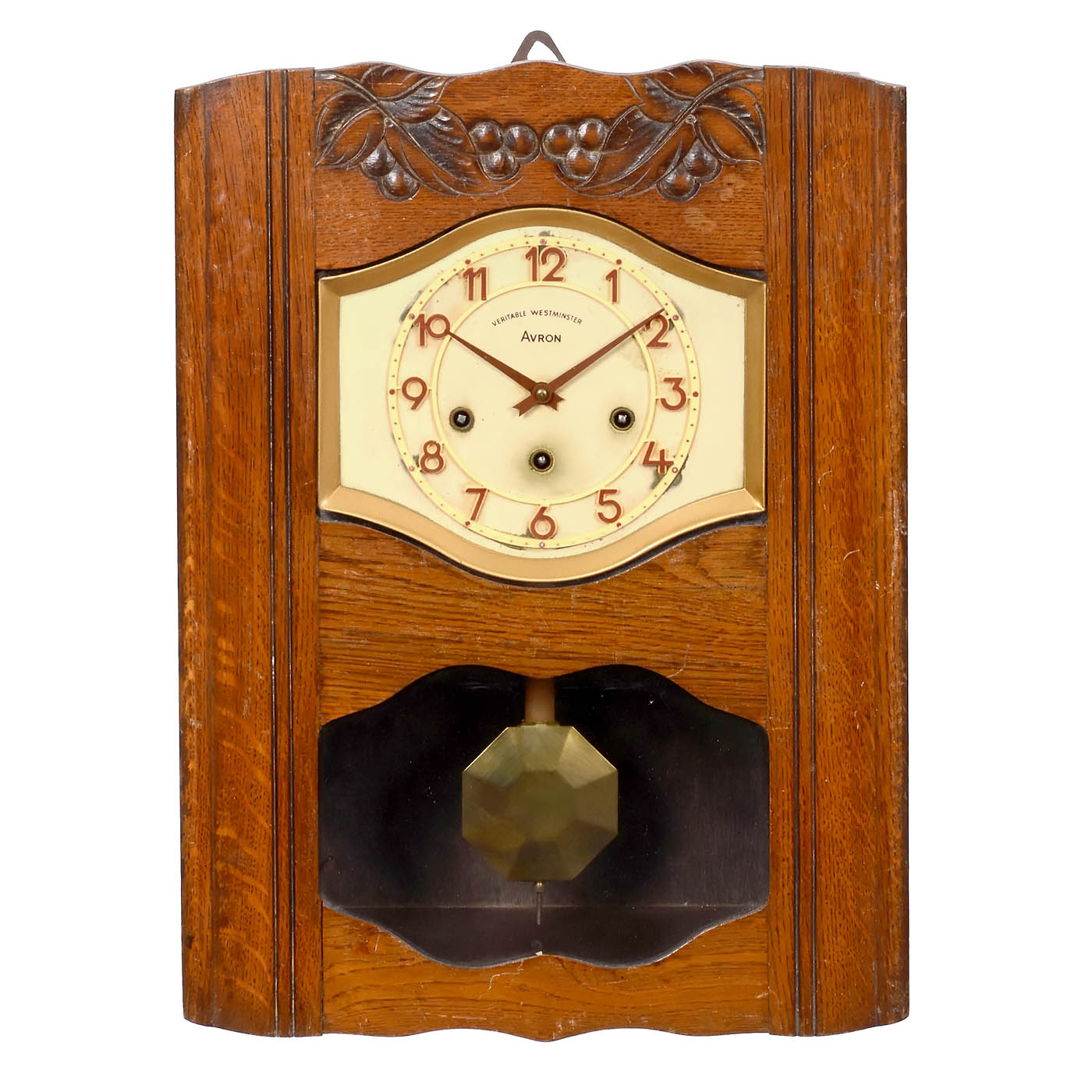 1) Girod, Fabrication Louis Girod & Cie., changeover chime movement Westminster/Du Jura, weekday, date and month display, hour-strike on bell bars, works, with key. - 2) Vedette, Fabrique d'Horlogerie La Vedette SA, changeover chime movement Westminster/Ave Maria, 6 notes, hour-strike on bell bars, works, with key. - 3) Unmarked, Westminster chime, hour-strike on bell bars, working. - And: 4) Avron, Westminster strike, striking the hour on bell bars, defective, hinge without screws, with key. - In addition: German wall clock, c. 1900, movement defective.