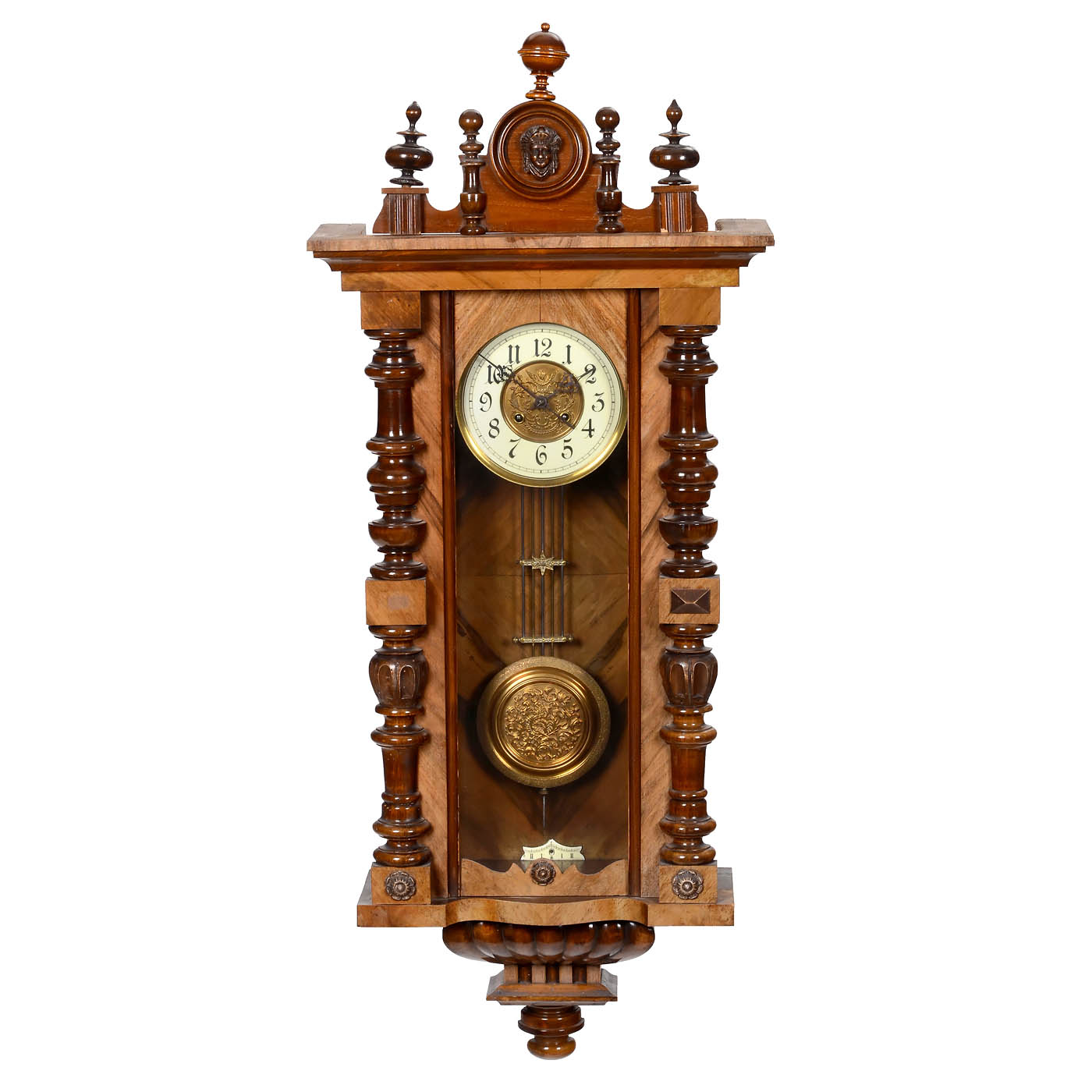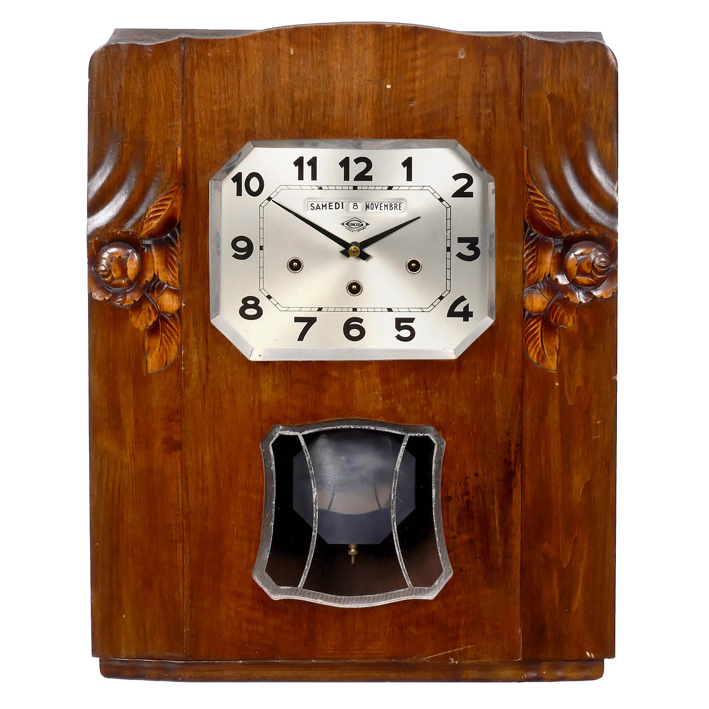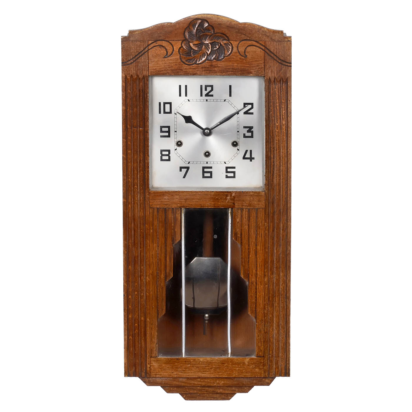 1) Girod, Fabrication Louis Girod & Cie., changeover chime movement Westminster/Du Jura, weekday, date and month display, hour-strike on bell bars, works, with key. - 2) Vedette, Fabrique d'Horlogerie La Vedette SA, changeover chime movement Westminster/Ave Maria, 6 notes, hour-strike on bell bars, works, with key. - 3) Unmarked, Westminster chime, hour-strike on bell bars, working. - And: 4) Avron, Westminster strike, striking the hour on bell bars, defective, hinge without screws, with key. - In addition: German wall clock, c. 1900, movement defective.