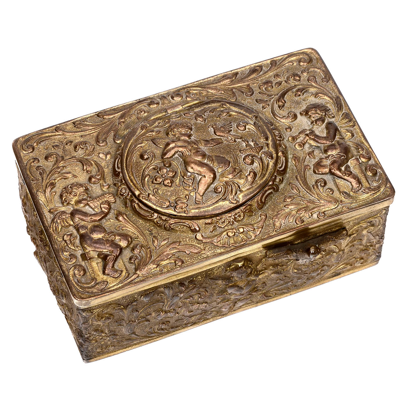 Model 5, with going-barrel movement, bird with iridescent plumage, moving wings, beak, perch and tail, in gilt-metal case with repousse decoration of cherub musicians, wd. 3 ½ in. (9 cm), without key, working but song weak.