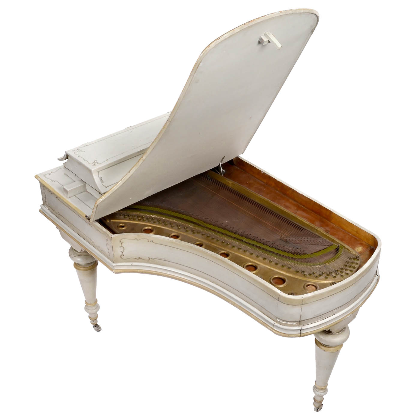 Giovanni Racca, Bologna, Italy. 73 notes, on folding card books, hand-turned mechanism, volume lever, cream-painted case, turned legs on casters, metal frame, 33 x 55 ½ x 39 in., partially working condition, in need of adjustment and tuning. With 58 books. Scarce in grand-piano-form.