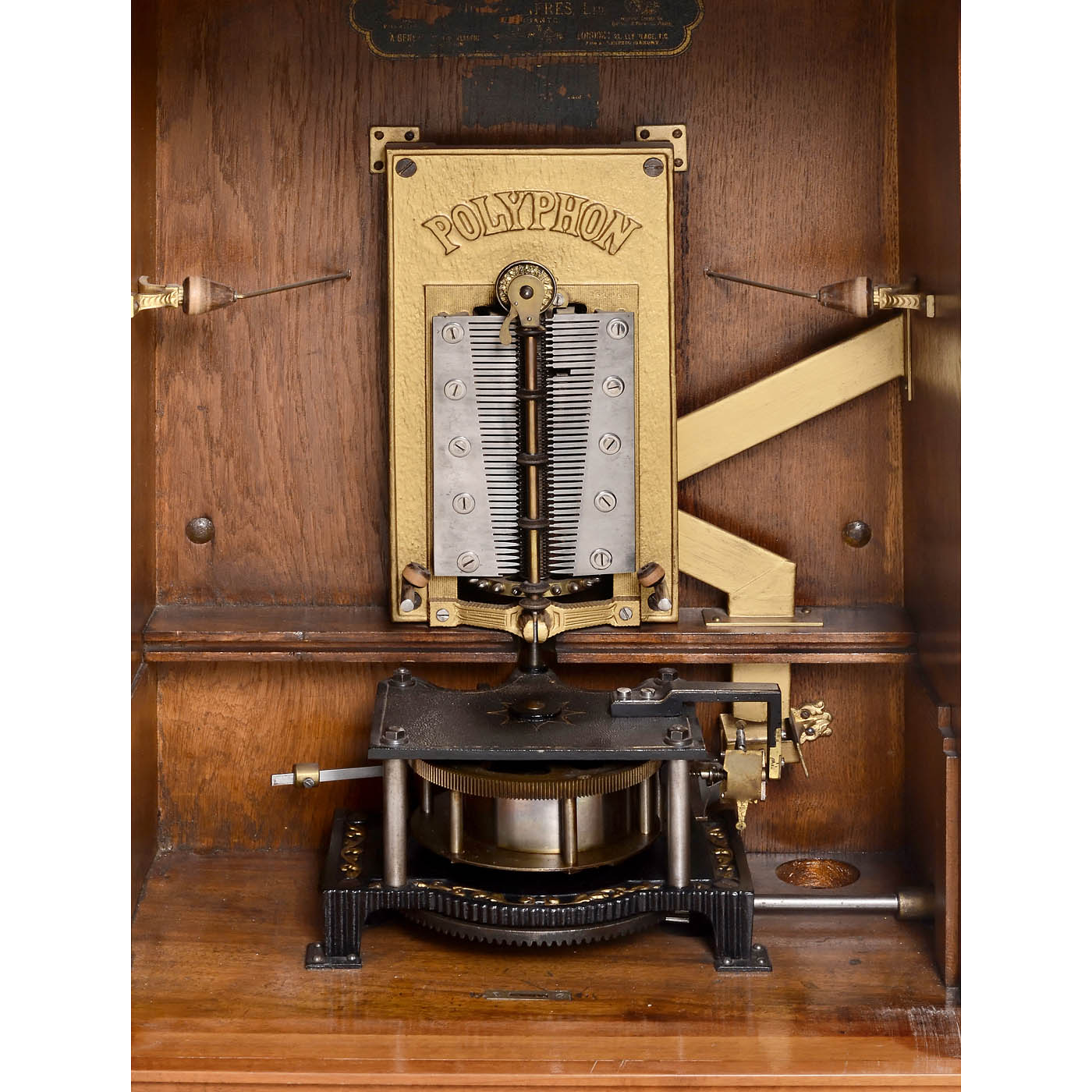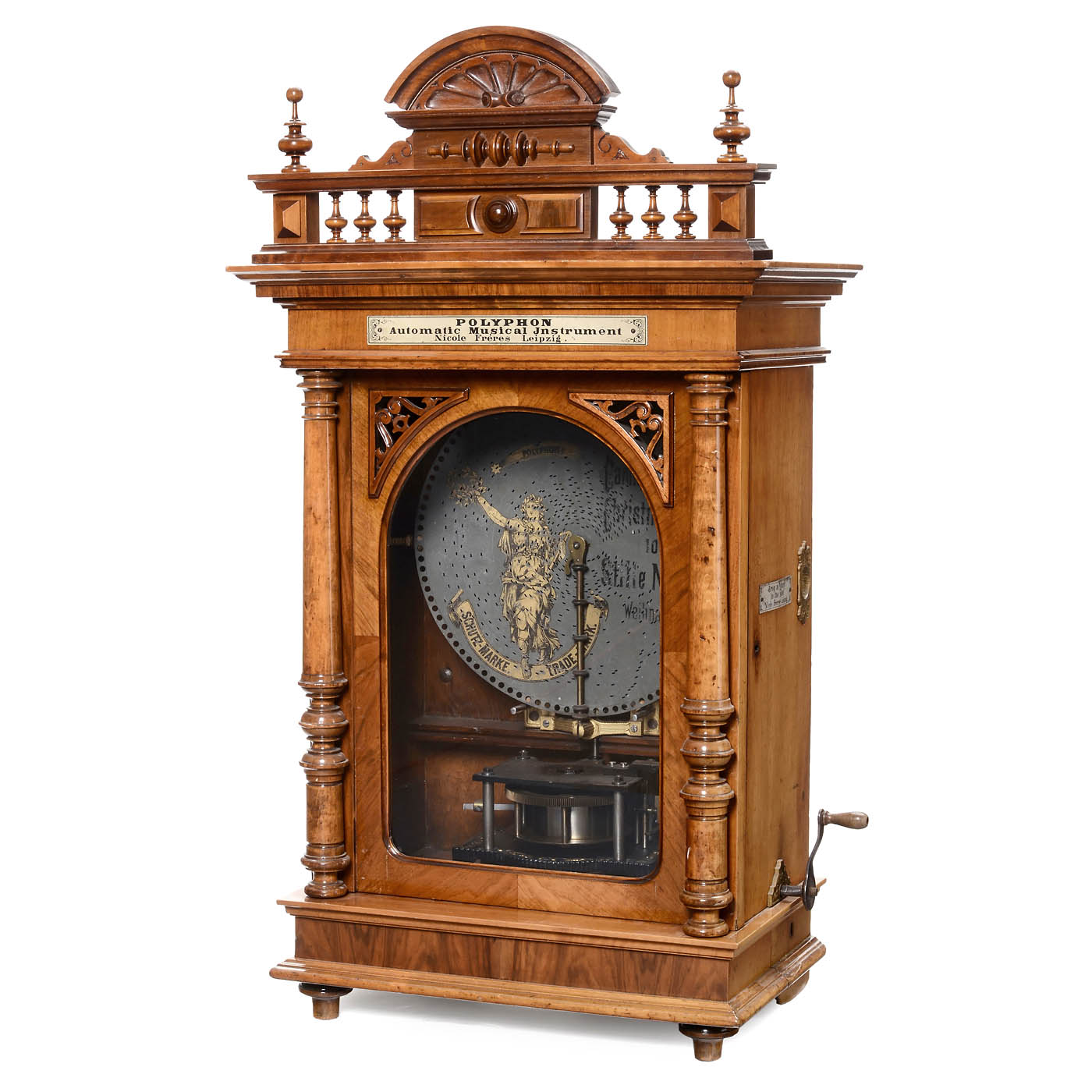 Polyphon Musikwerke, Leipzig. For discs of 15 ½ in., coin-operated, 78 teeth in duplex comb (1 broken), walnut case, top pediment later, height 43 1/3 in., with 25 discs, good playing condition.