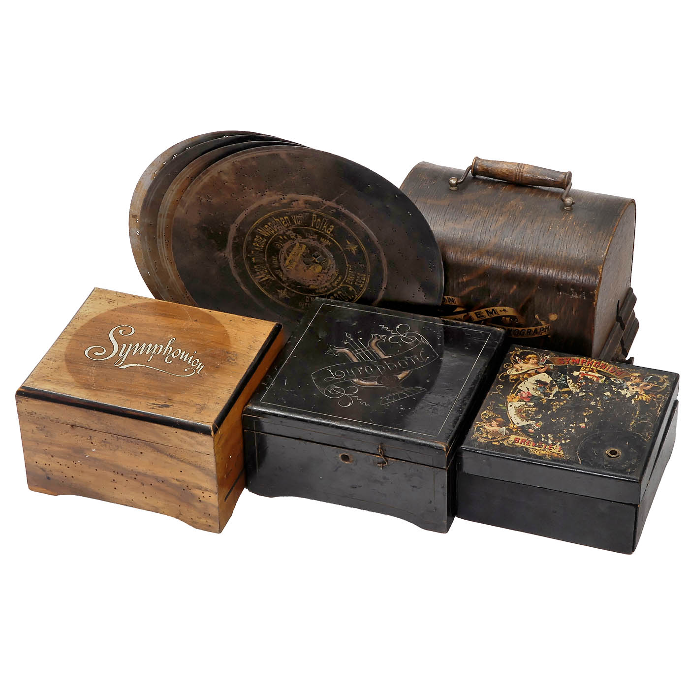 1) Symphonion Musikwerke, Leipzig. Musical box for 7 1/2-inch discs, 43 teeth in steel comb, spring defective, with crank and 5 discs. - 2) The Graphophone Type Q, American cylinder phonograph, spring motor works, reproducer defective, missing horn, with wood lid. - 3) Symphonion Simplex, musical box for 5 3/4-inch discs, 40 teeth in steel comb (4 broken), ratchet-wind, playing. - 4) 3 empty cases, 2 for Symphonions, 1 for a Lyraphon. - 5) 4 Symphonion discs, Ø 10 5/8 in. - 6) Wood cover for Edison Gem phonograph. - And: 7) 3 boxes with spare parts for gramophones and musical boxes.