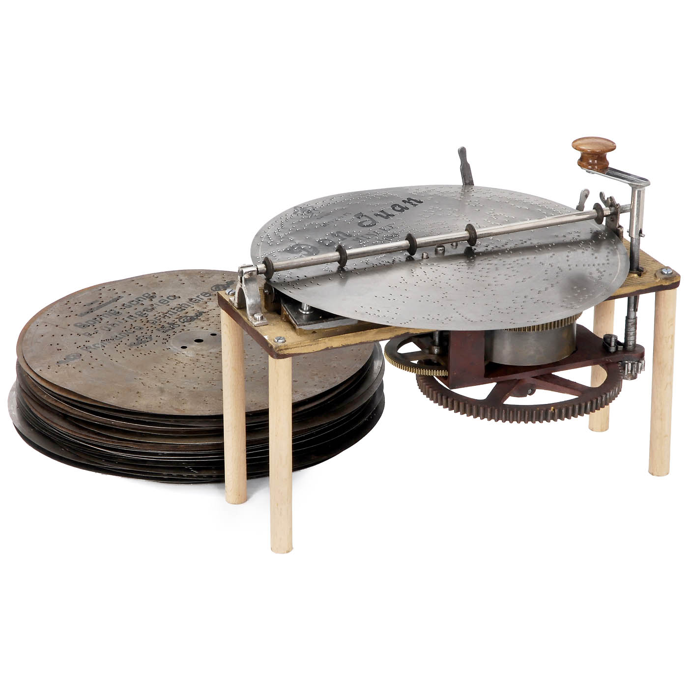 By Mermod Frères, Switzerland. Serial no. 67827, for 12-inch discs, with 63 teeth in steel comb (complete, 2 teeth neatly repaired), speed control, without case, working, with crank and 34 discs.