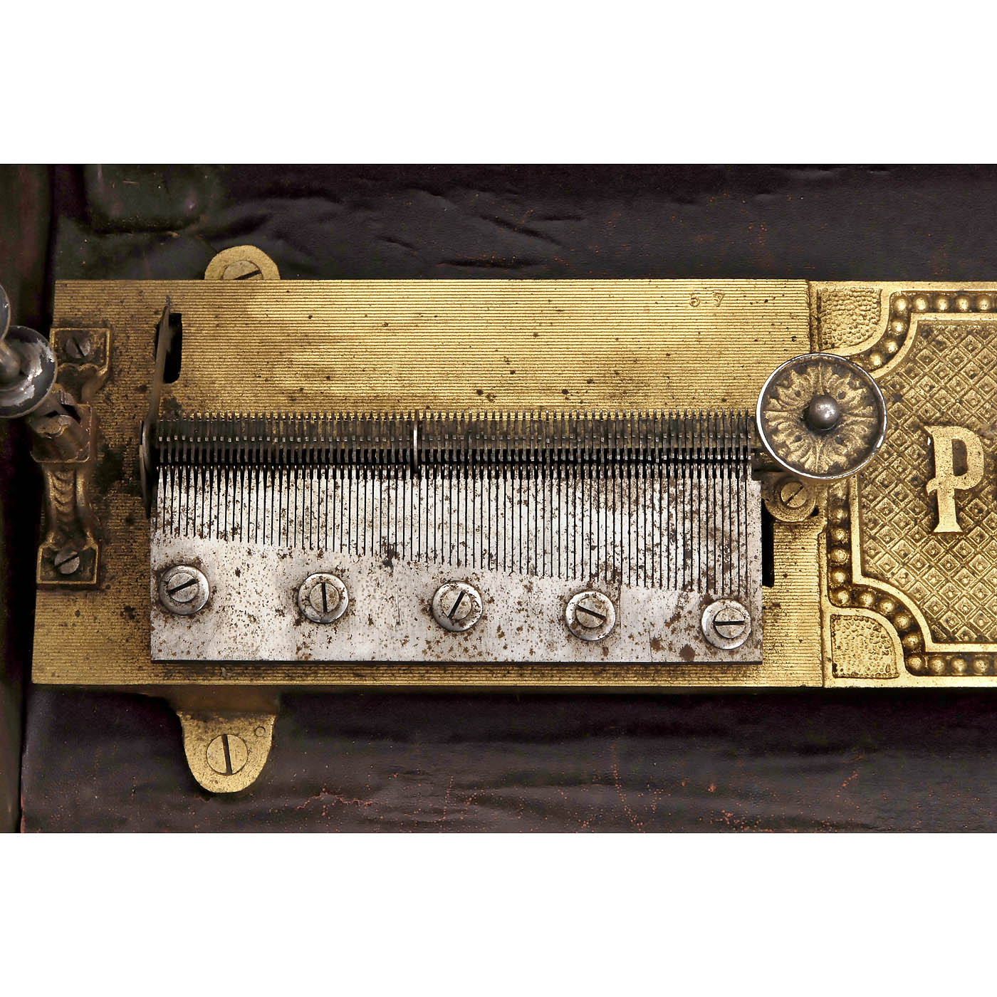 Style 43, Polyphon Musikwerke, Leipzig, for 15 ½-inch discs, with 77 teeth steel comb (complete!), walnut case, inner lid with chromolithograph, speed control, including 26 discs. - Good playing condition, case with considerable damage to the veneer and lower mouldings. Rare to find with this unusual spring drive!