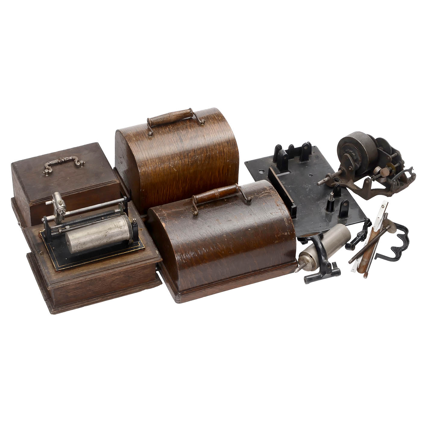 1) Approx. 220 Edison 4-minute cylinders, mostly Blue Amberol, 27 empty boxes and approx. 15 cylinders from other manufacturers. - 2) Edison Standard parts, including motor, reproducer bracket and baseplate. - 3) 2 Edison wood lids and 3 replica horns. - And: 4) Phonograph, probably Excelsior, without reproducer and horn.