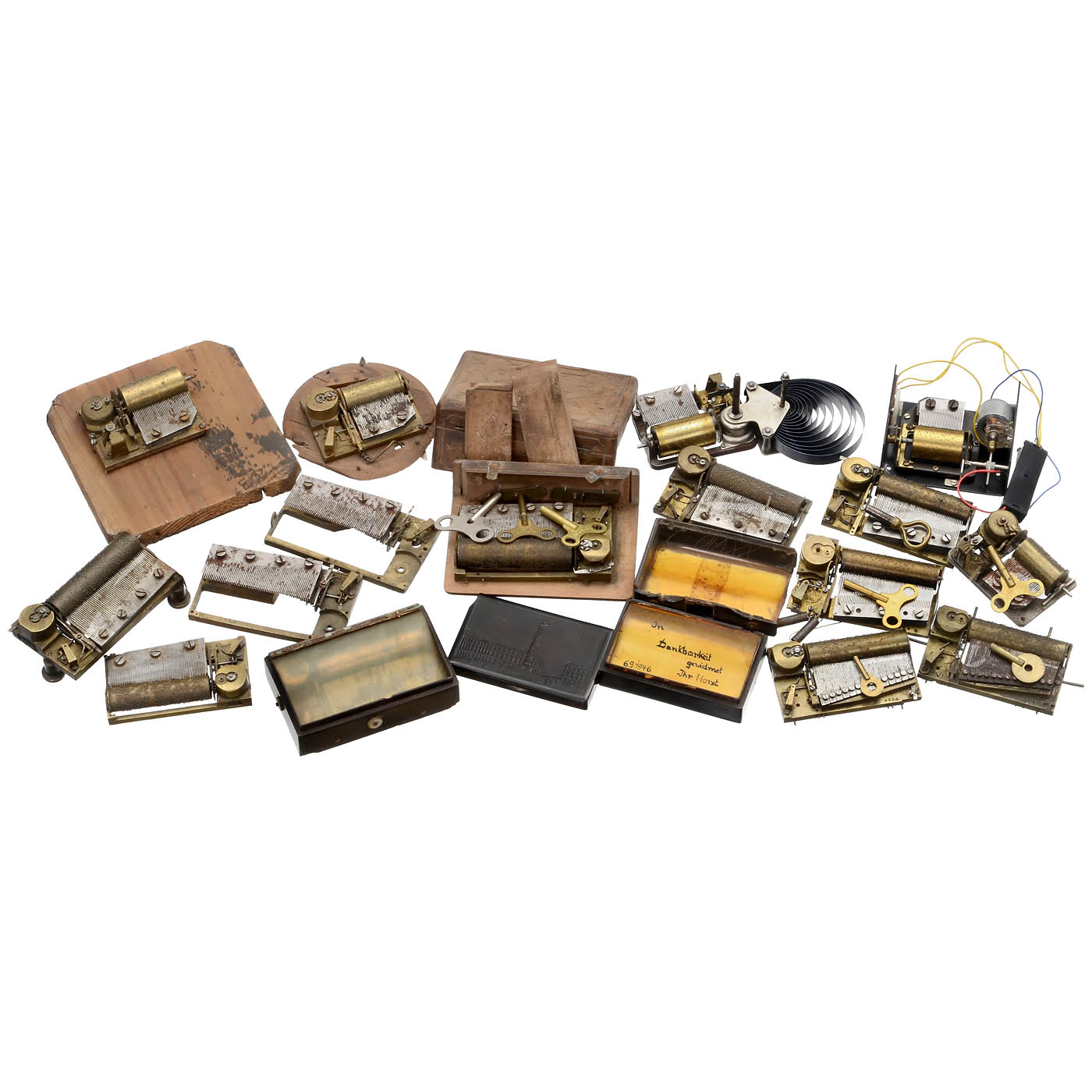 A tabatière movement with sectional comb; 4 tabatière movements with single-piece combs; 2 tabatière movements with single-piece combs and incomplete cases; 3 small single-air movements; 2 small 20th century movements with unusual motors; 4 incomplete movements; and part of a dismantled composition case depicting Place Vendôme, with inscription "In Dankbarkeit gewidmet, Ihr Horst, 6.9.1946". Some keys included, all movements untested. - A useful lot for restorers.