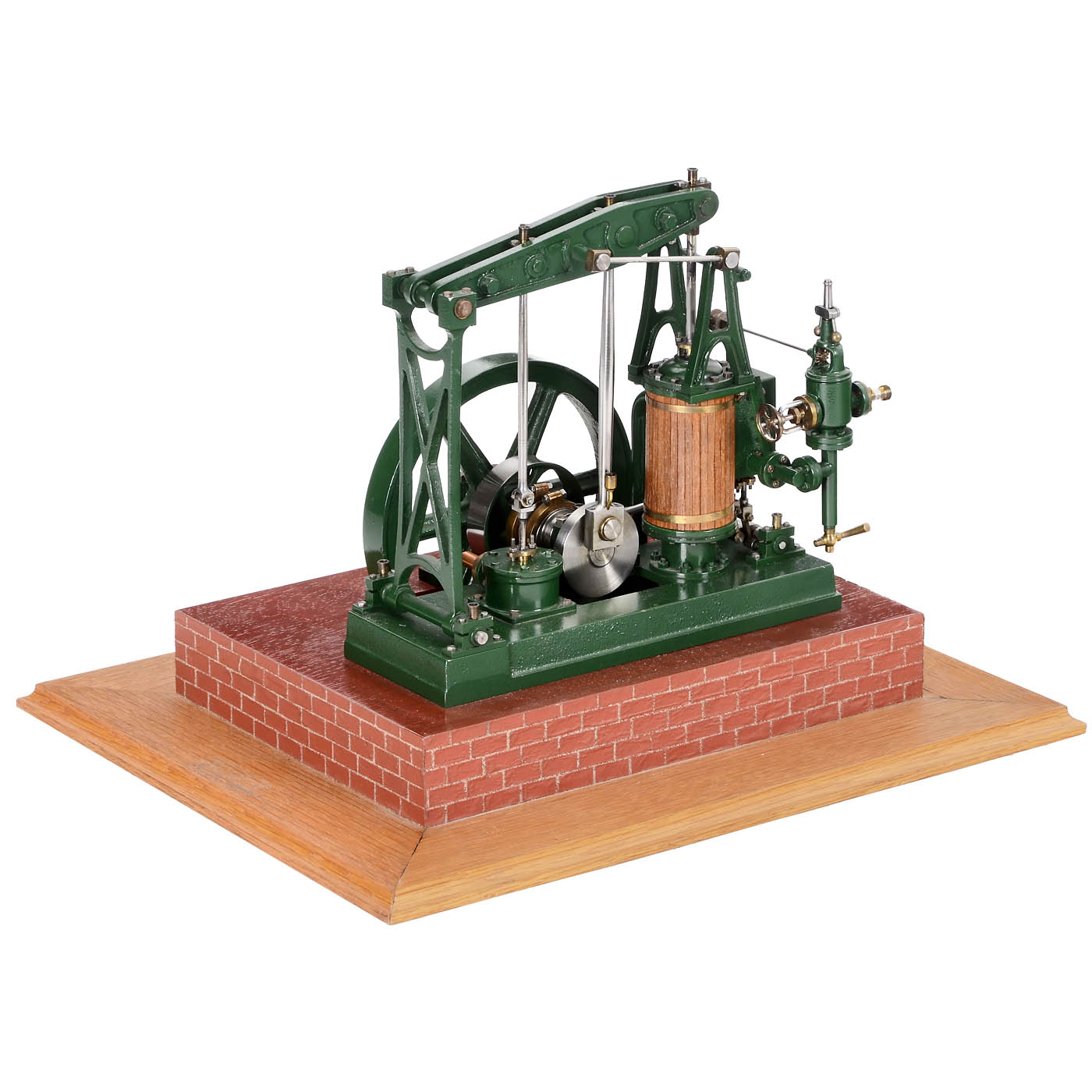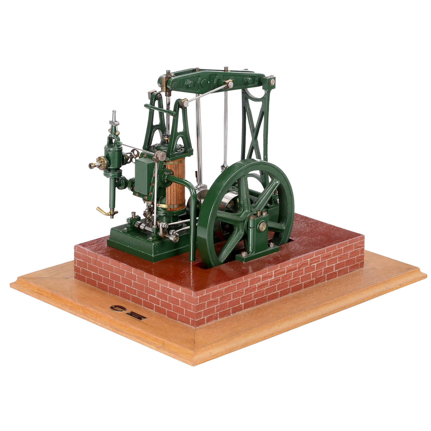 After an English original of 1892, polished-steel, cast-iron and brass construction, partly green-lacquered, with pump, double beam, disk crank and Meyer valves, with brass maker’s plaque on base: "Kølsen Maskiner, Danmark, No. 67", cylinder Ø 1 1/3 in., spoked flywheel Ø 5 in., height 7 3/4 in., working condition.