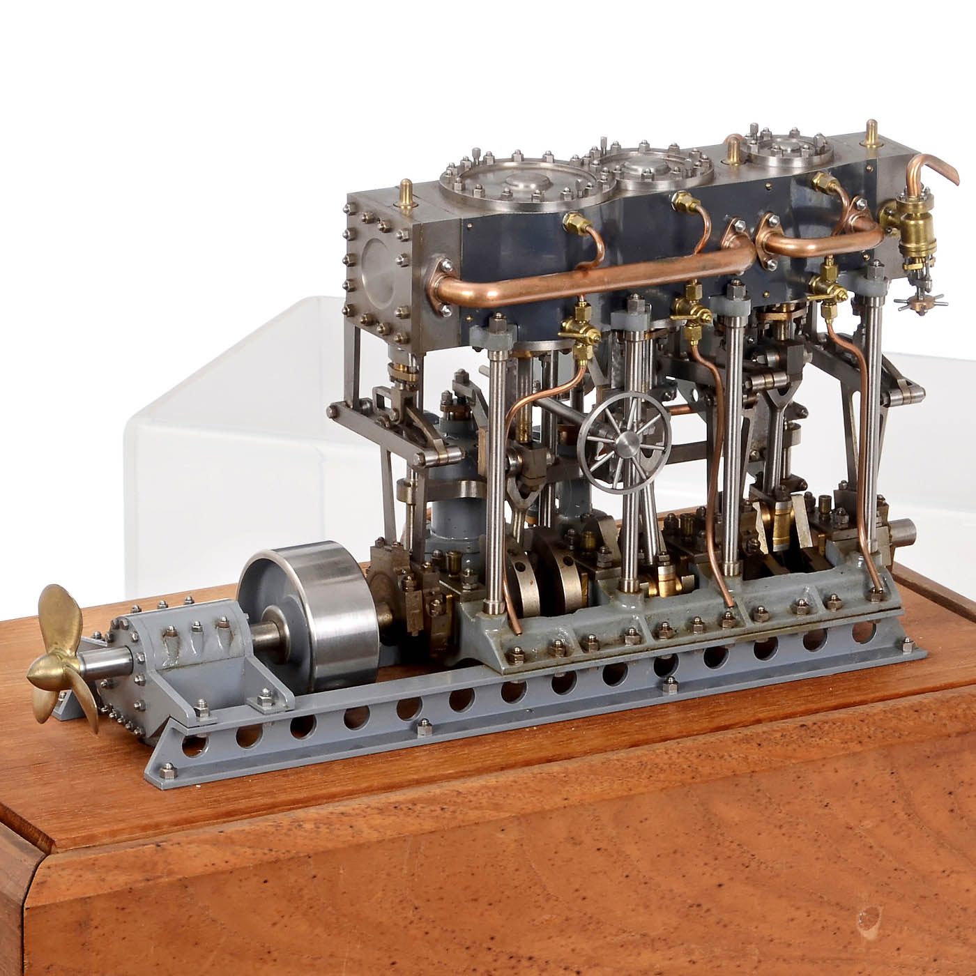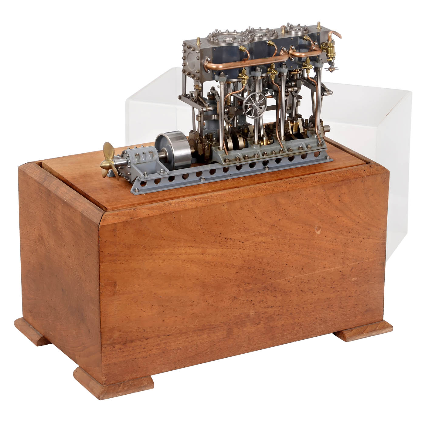 Brass, polished steel and cast metal, high, medium and low-pressure cylinders Ø 2 1/8,1 ¾ and 1 1/4 in., with reversible direction of rotation, sliding control with eccentric ring and reverse eccentric, crosshead guide, crankshaft with counterweights, condensation water tank with pump, flywheel Ø 2 in., ht. 6 7/8 in., resinous, on wood base with 220-volt electric motor (untested), overall dimensions with plexiglass cover 17 1/3 x 10 ¼ x 17 ½ in.