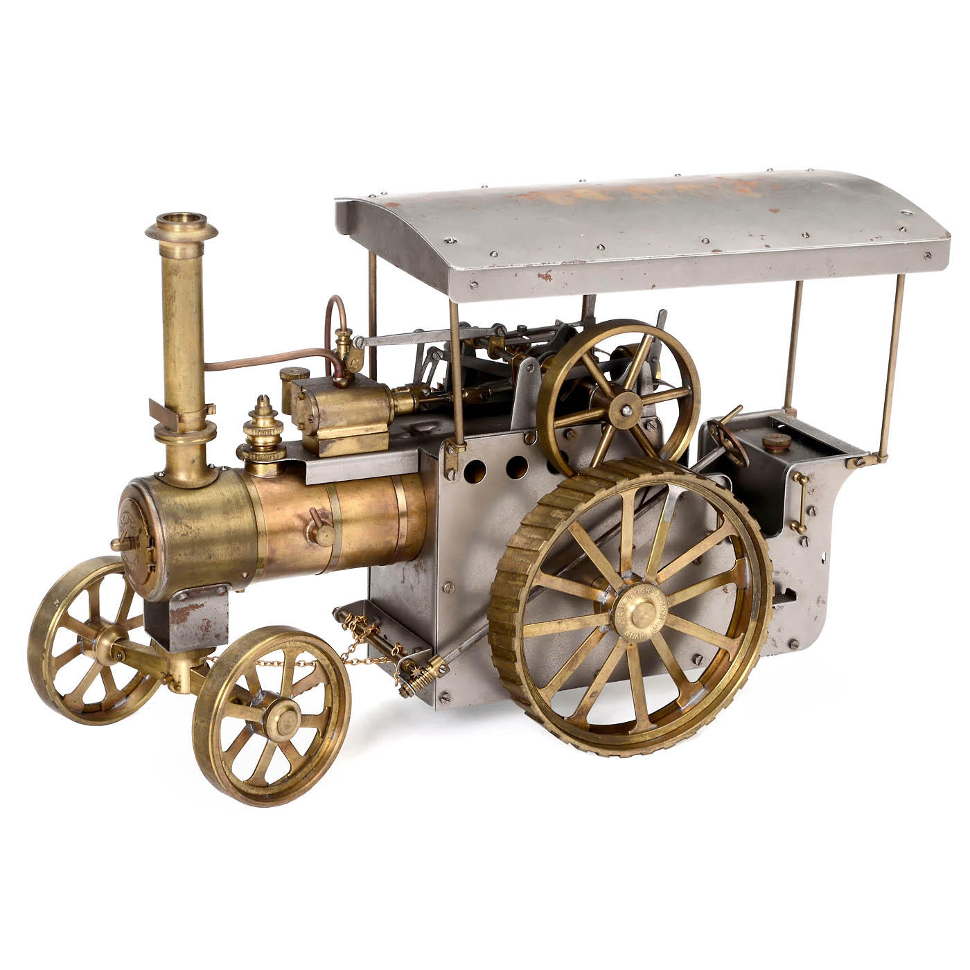 Birmingham, England, type 2, unfinished all-brass and steel construction, spirit-fired silver-soldered brass boiler, double-action single cylinder, slide-valve control, Stephenson valve gear, reversable, steerable front axle, spoked wheels, length 12 in., with spirit lamp with 2 wicks and manual in box. A skillfully engineered model for collectors and steam enthusiasts.