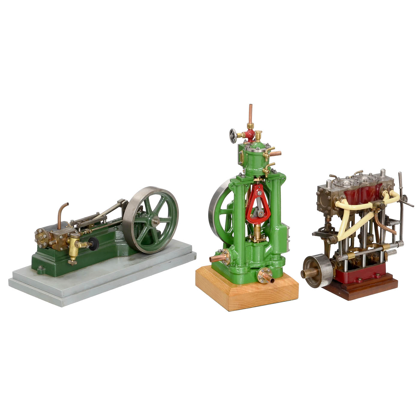 1) Vertical steam engine with water pump, marked "F" on the valve cover, brass, cast metal and steel, cylinder Ø 1 1/3 in., 2 water drain cocks, rod directly connected to water pump, flywheel Ø 4 in., overall height 10 4/5 in., slightly resinous. - 2) Stuart Mill Engine S50, horizontal, cylinder Ø 1 1/10 in., crosshead guide, flywheel Ø 3 2/3 in., base 8 ½ x 2 in., works. - And: 3) Vertical two-cylinder steam engine, cylinders Ø 1 ½ in. each, 4 water drain cocks, crosshead guide, reversible, slide control with eccentric ring and reverse eccentric, overall height 6 ½ in., slightly resinous.