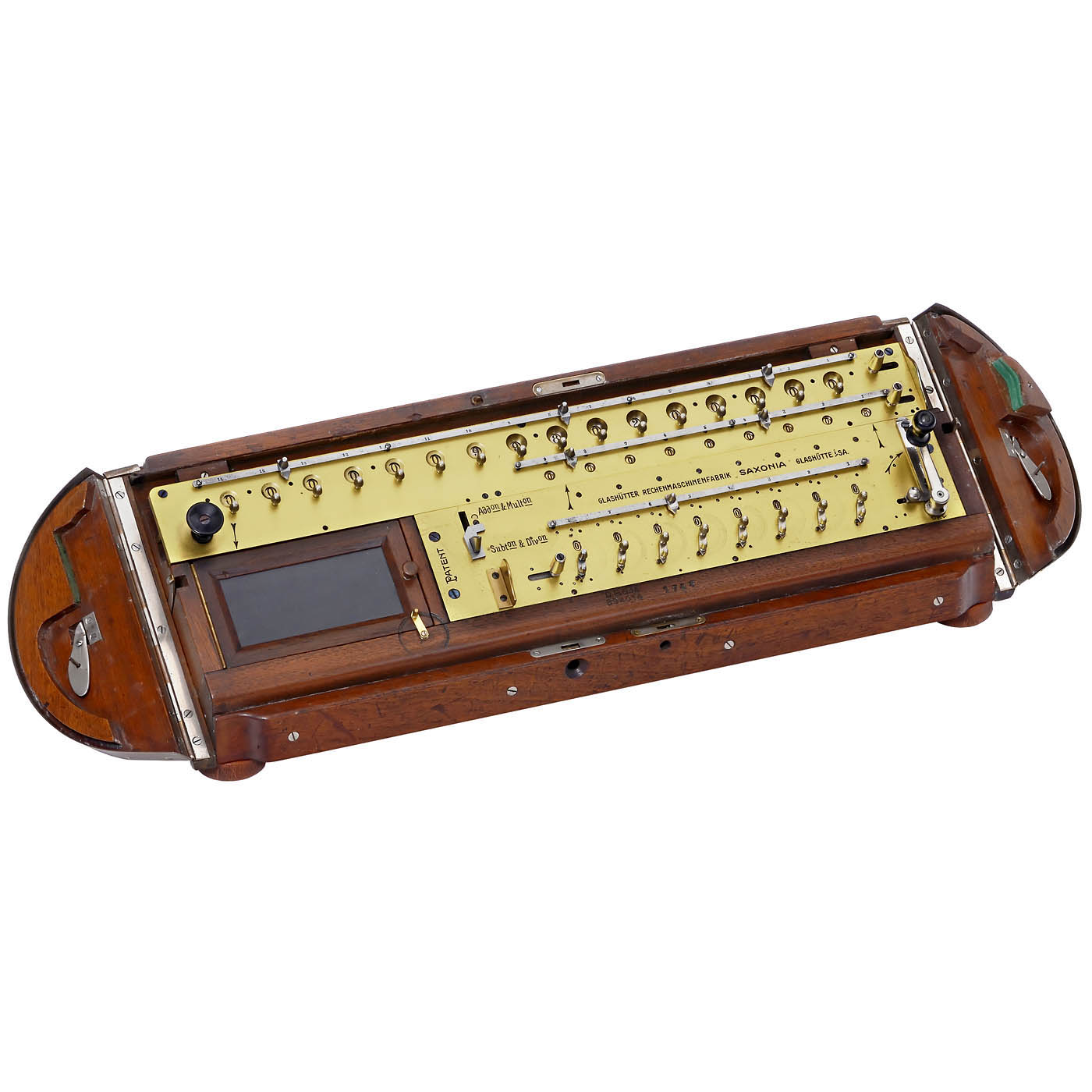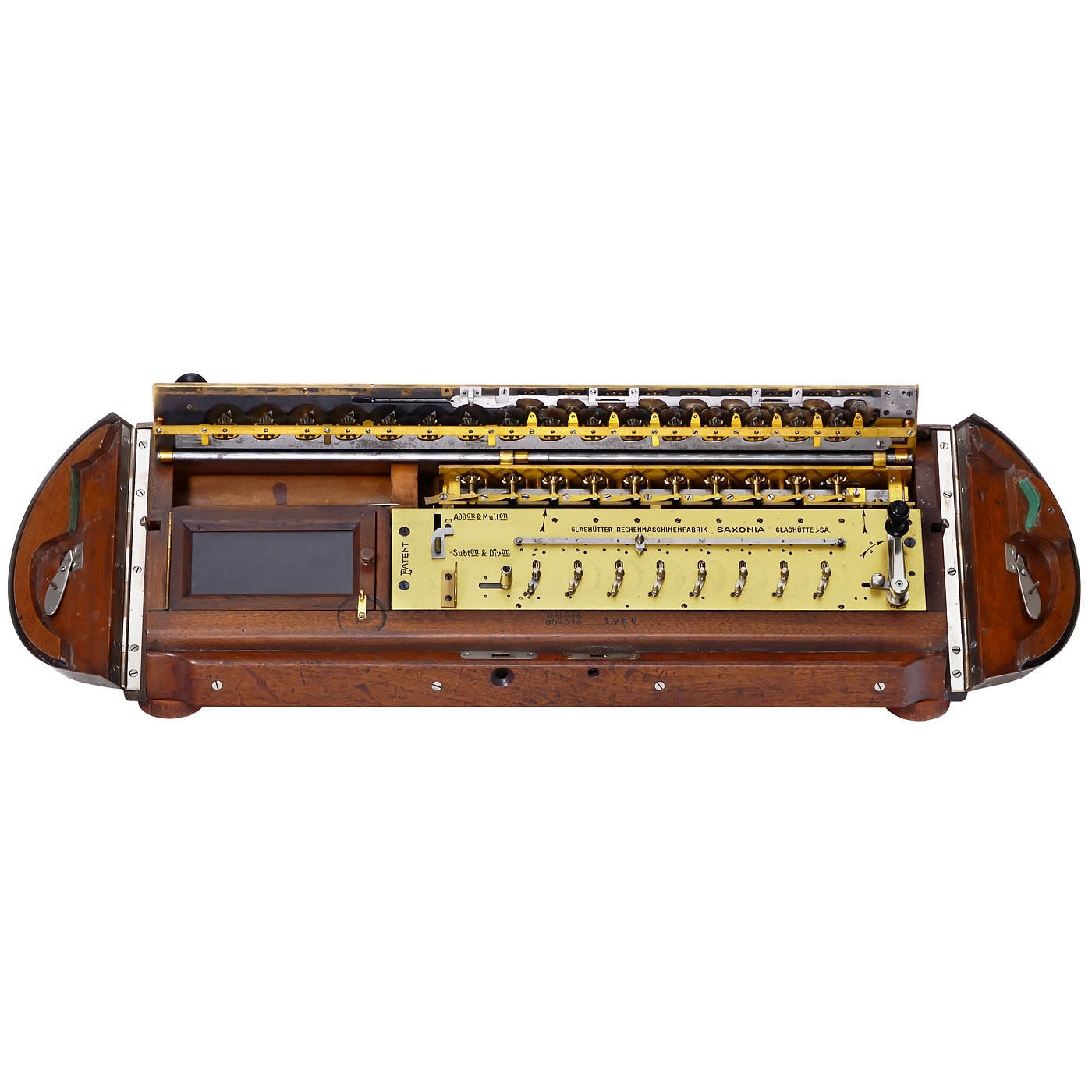 Serial no. 1738, stepped-drum calculating machine by Glashütter Rechenmaschinenfabrik Saxonia, German trademark DRGM no. 394014, with rotary-lever-setting with small dial discs (patent DE217048 from 1908), 8-, 9- and 16-digit calculating, writing field with slate board, 2 locks with keys, very attractive tambour sliding cover and hinged sides (DRGM from 1910)! – Literature: E. Martin, p. 133. – One of the most desirable early calculators!