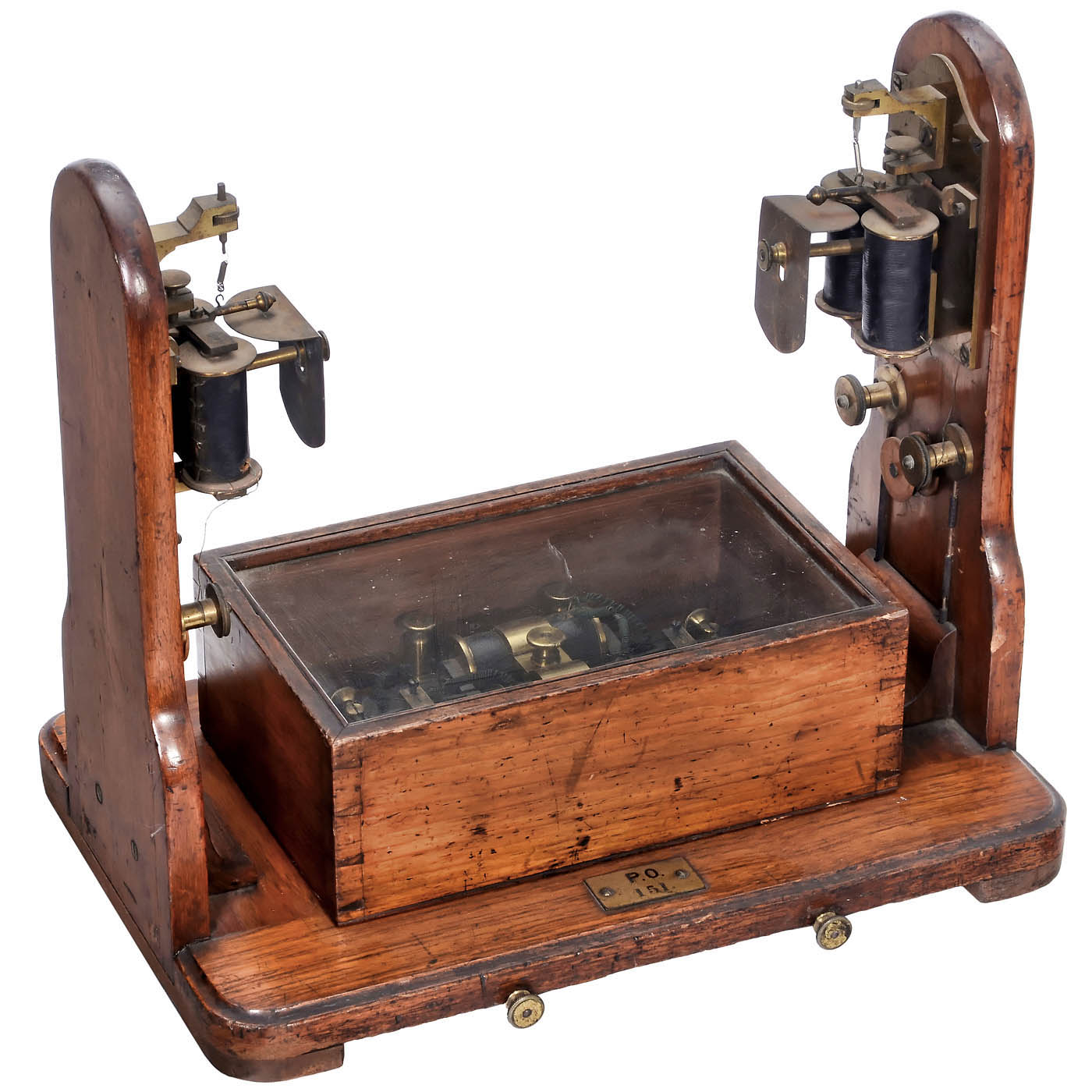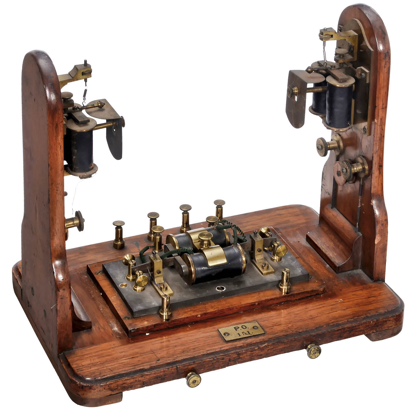 Invented by Charles Bright, with 2 sounders and double relays, in mahogany superstructure with brass plaque "P.O. 151", 15 x 10 x 13 in. – Note: This type of device was used by the British and Irish Magnetic Telegraph Company between 1855 and 1868. Capable of receiving acoustically and using a separate pair of tappers with different sounds, the telegraph requires only a single wire circuit and works with the "European Alphabet", a German adaptation of the American Code. This type of telegraph was soon made obsolete by the Morse telegraph sounder. – The earliest form of acoustic telegraph instrument used in Great Britain.