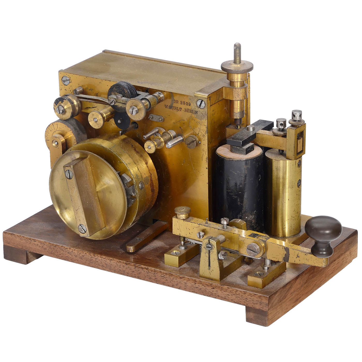 Ink writer, marked "W. Gurtl, Berlin", no. 2529, original lacquered brass, spring-driven motor, working, with folding Morse key on walnut base, size only 7 ¾ x 4 ½ in.