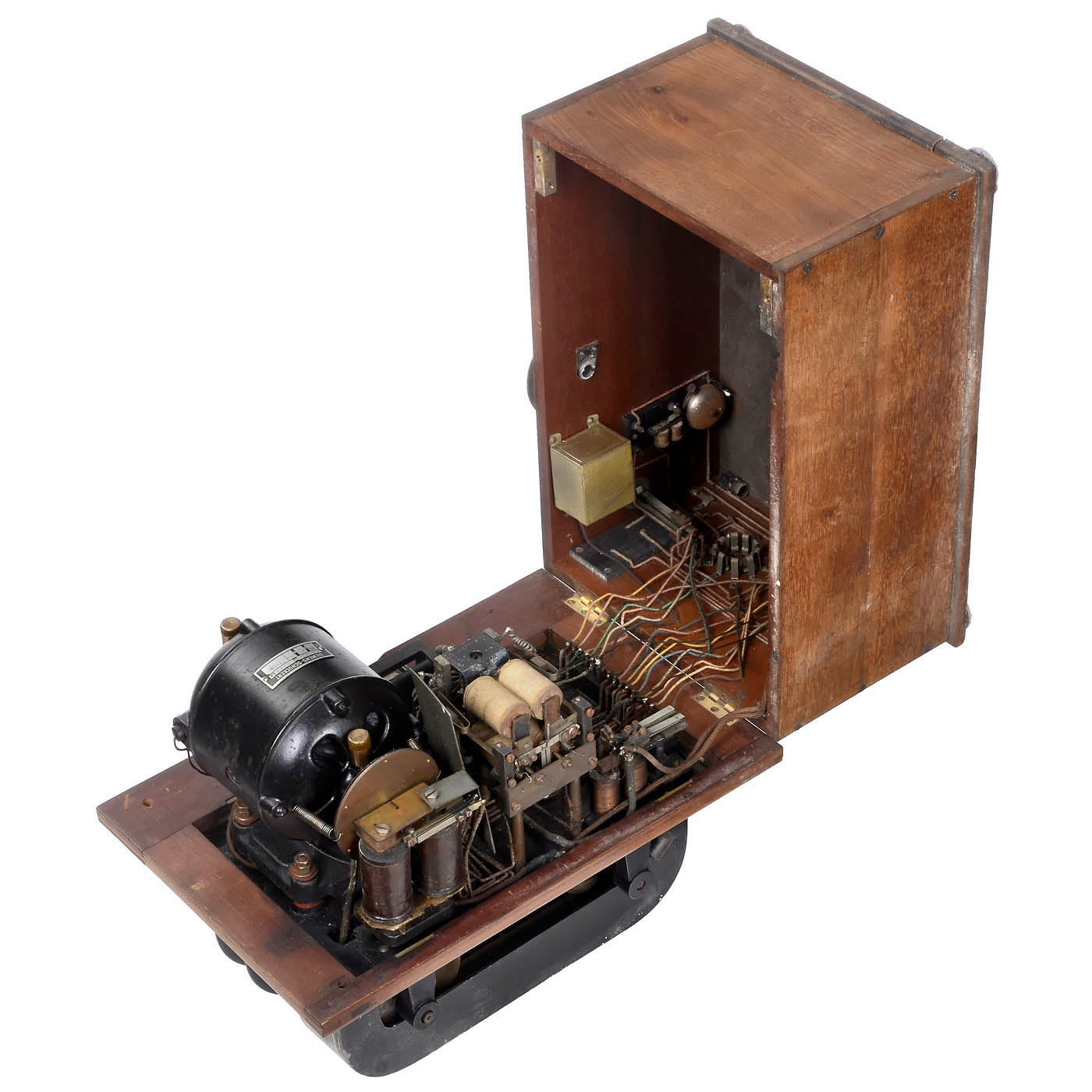 Aktieselskabet Dansk Telegrafonfabrik, Copenhagen, Denmark. No. 128, for magnetic sound recording of tones (e.g. telephone conversations) and their subsequent playback. – Electric drive (110 V), with recording and playback head, oak case, very good original condition! – Note: The forerunner of the tape recorder was the magnetic Telegraphone, invented in 1898 by the telecommunications engineer Valdemar Poulsen in Denmark. The Telegraphone was based on a theory of magnetic storage published by the French physicist Paul Janet in 1887, but it was Poulsen who first put this theory into practice. Poulsen filed his first patent for the wire recorder in 1898 and demonstrated his first devices at the 1900 Paris World's Fair. On 12 October 1901, the opening evening of an exhibition at the Gustav Pisko Art Salon in Vienna, he also recorded the voice of Emperor Franz Joseph; the recording survives and is considered the oldest magnetic sound recording. The reproduction quality of the Telegraphone was clearly inferior to that of Edison's Dictaphone. For this reason, it was not commercially successful and only a few devices were produced. It was not until the invention of the amplifier tube that this technology was used again. All of today's magnetic recording methods, including the hard disk and magnetic stripes on credit cards, trace their origins to Poulsen's invention.