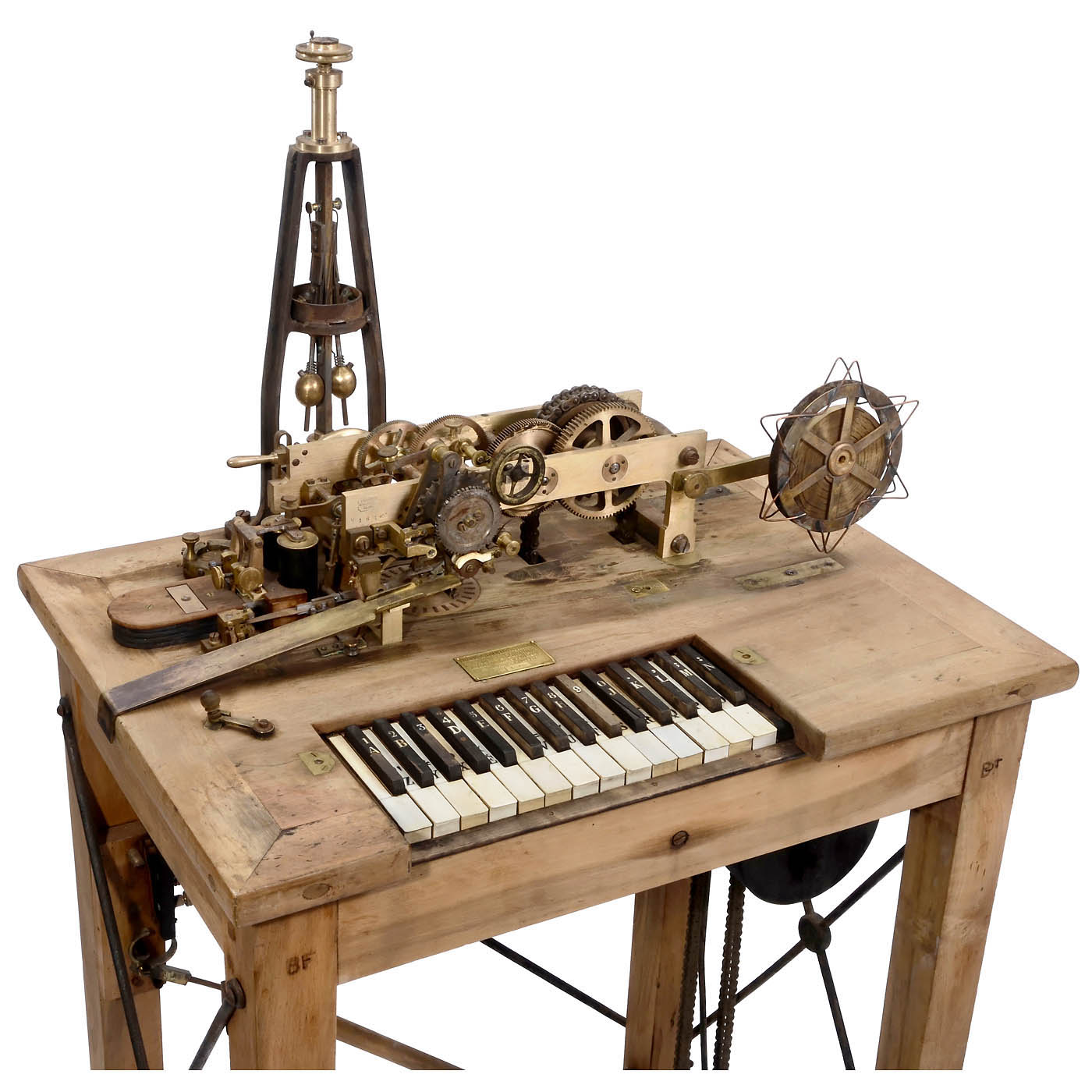 Ateliers L. Doignon, Malakoff, Paris. No. 1810, synchronic printer for letters, numbers and characters, weight-driven (counterweight not included), with regulator, probably by Siemens & Halske, 28 keys (each with double function), brass mechanism on wood base, size: 21 x 29 ½ x 57 in. – Literature: Karrass, "Gesch-ichte der Telegraphie", 1909, pp. 252ff. – Fürst, "Das Weltreich der Technik", 1923, pp. 53ff. – Note: Invented by David Edward Hughes in 1856, a significant milestone in communications history.