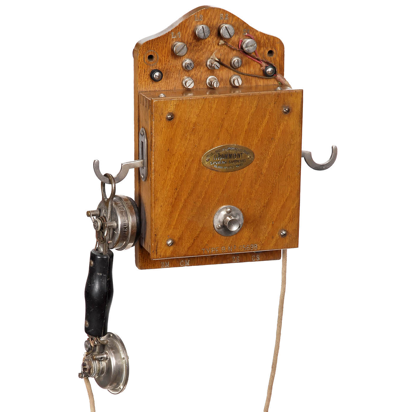 1) Picart-Lebas systems, c. 1908, Societé des Téléphones, Paris, walnut case, hook switch, receiver with special shape known as "Queue de Billard", a compromise between the classic receiver and the speaking horn, technically the microphone and receiver are arranged back to back. – And: 2) Grammont, system "Eurieult", type 9, Société des Porcelaines & Appareillages Électriques, Paris, oak case, hook switch, handset marked "Hygienophone", without second receiver.