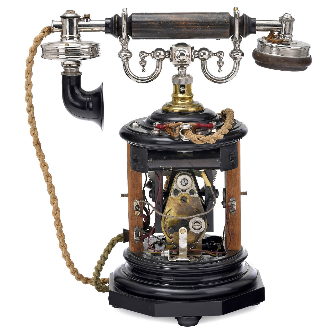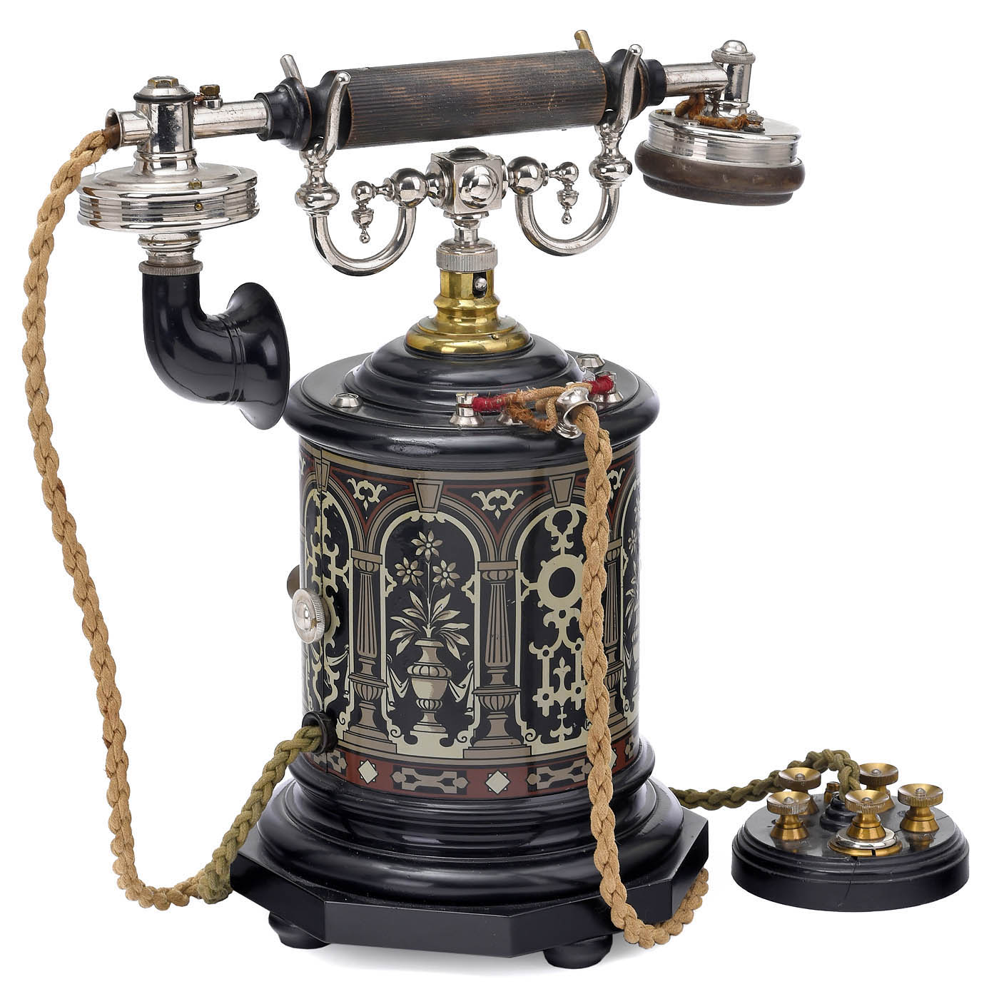 Extremely rare Swedish telephone, export model, with crank inductor, circular pressed lithographed tin case, "Ericsson" handset and wood base. – Excellently restored condition!