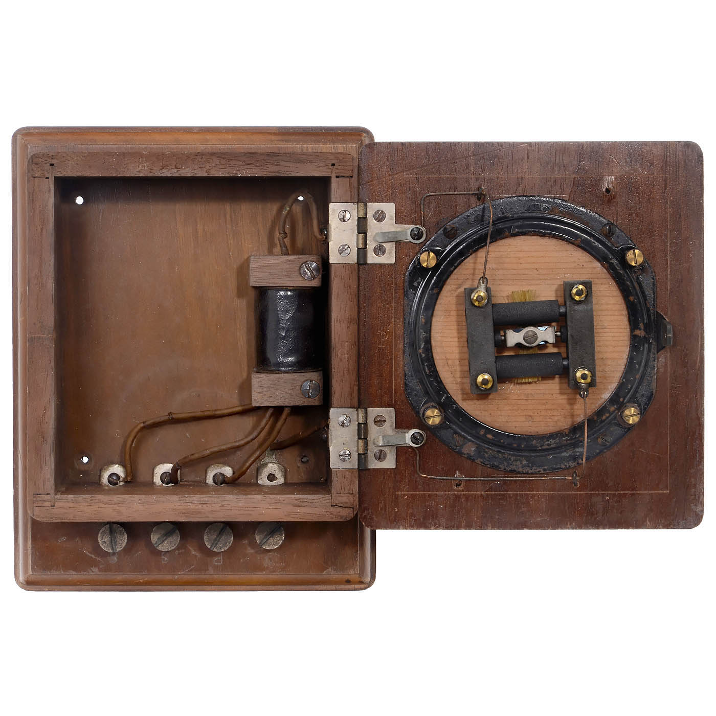 Berlin, 2 bars of carbon are placed loosely between two terminals, in front of wood membrane, in walnut case with 4 electrical connections, very good original condition.