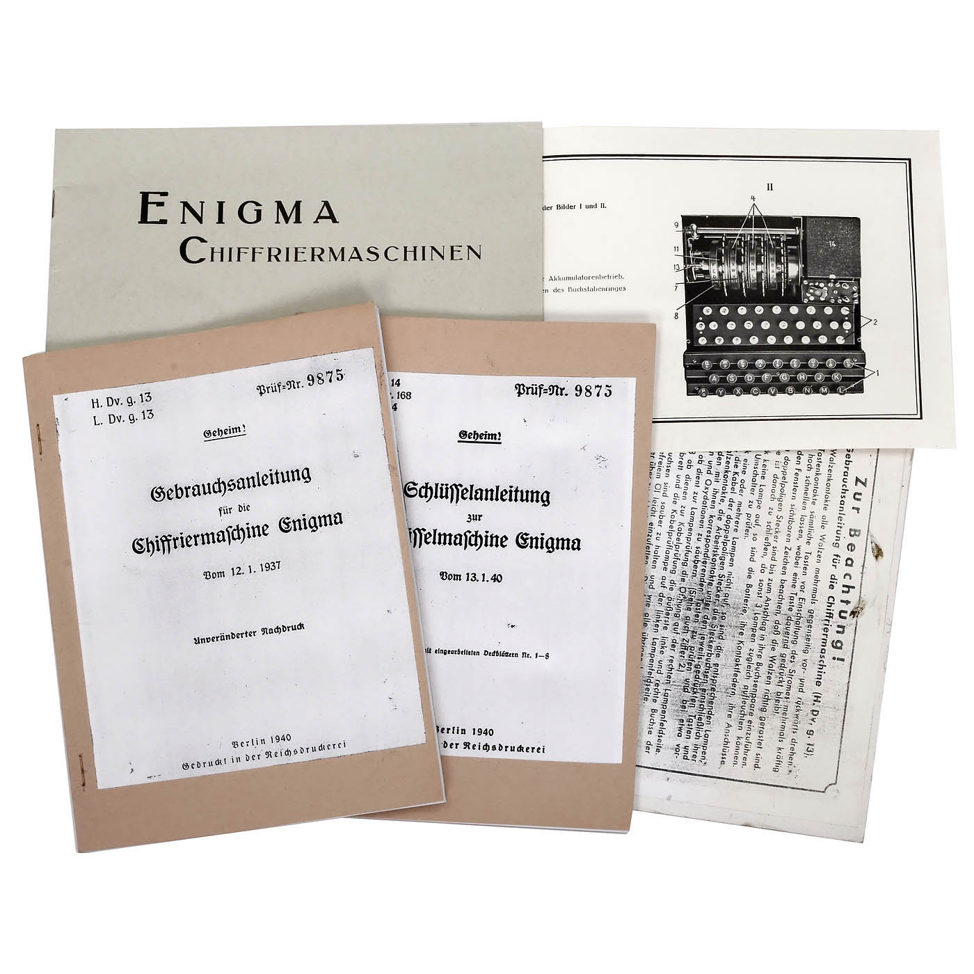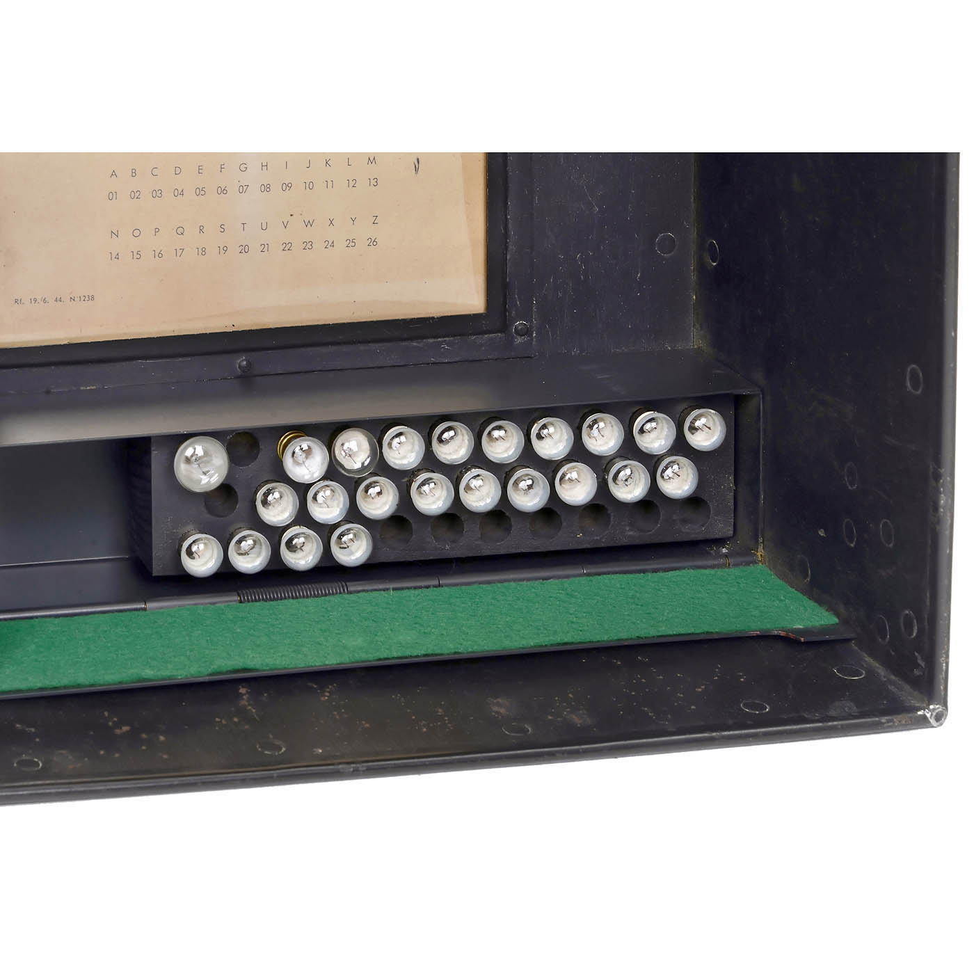 Chiffriermaschinenfabrik Heimsoeth & Rinke, Berlin. Serial no. "A 17867 / jla / 1944". With 3 original wheels, marked: (I) A 17867 S, (II) A 17867 S and (III) A 17867 S, each with one notch, reflector wheel marked A 17867 S, without lettering on the housing. – The sequences of the special wirings are: Endplate A to Z continuous, wheel I = IQYUNKDFMPROZXSHGCLVTEBWSA; wheel II = QYMFIUNKOXVTZJHGPLECSWRBDA; wheel III = EHYGUMVIROXTKFQANCJDPBZWSL; reflector wheel (UKW) = BANPHTYEOWMVKCIDZUXFRLJSGQ; standard QWERTZ keyboard of 26 keys, white symbols on black backgrounds, battery switch, plugboard with 16 plug cables, battery casing, in original pressed wood case with original 'Zur Beachtung' instructions inside the lid, minor crack under the keyboard, plugboard tin cover replaced, replica battery, working condition, electrical functions checked, with copy of the manual. – Note: An important example of the legendary World War II ciphering machine developed by Berlin engineer Dr. Arthur Scherbius and first manufactured commercially by the Chiffriermaschinen Aktiengesellschaft Berlin in 1923. So complex was the Enigma, it was considered capable of producing over 22 billion code combinations without a single repetition. According to an early prospectus, "if one man worked continuously day and night and tried a different cipher-key every minute, it would take him 42,000 years to exhaust all combination possibilities." In operation, each keystroke illuminated a different character and caused one or more rotors to shift fractionally, so that a different combination was created every time. Decryption required codebooks and a list of daily key settings.