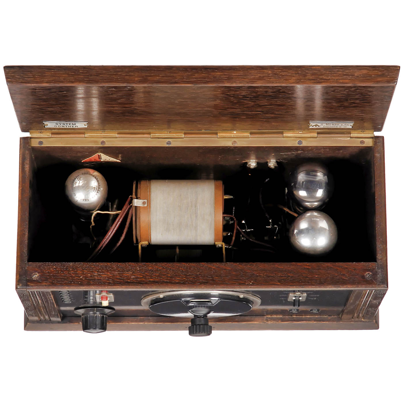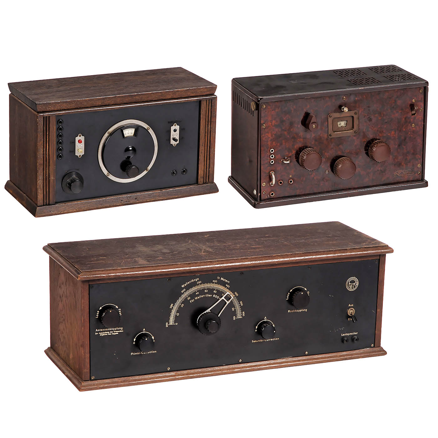 1) Mende E 52, c. 1928, Radio H. Mende & Co. GmbH, Dresden, 3 tubes, long wave and medium wave, battery-operation, for external loudspeaker, wood case, complete with tubes. – 2) Nora Netzanschluss-Empfänger K3Wf, c. 1929, Nora, Berlin, 4 tubes, long wave and medium wave, 120, 220 and 240 volts AC, for external loudspeaker, metal case, complete with tubes. – And: 3) Reico Neutrodyne RF244, c. 1927, Reico Radio, Max Reinhardt & Co., Berlin, 4 tubes, long wave and medium wave, battery-operated, for external speaker, wood case with lid, complete with tubes.