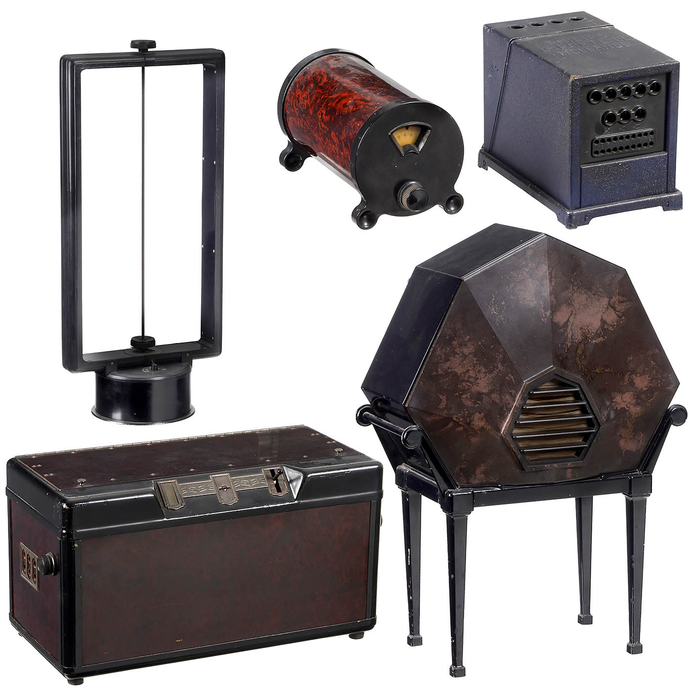 Philips, Eindhoven. Consisting of: 1) Radio receiver model 2511, 5 tubes, long wave and medium wave, 85–253 volts AC. – 2) Frame aerial 4104, scale on the frame below the rotary knob, height 30 ¾ in. – 3) Philector 4180, pre-selection and blocking filter for use in-between antenna and receiver. – 4) High-tension supply unit 3009, 4 anode voltages and 3 adjustable negative grid bias voltages, for 225-volt AC supply. – And: 5) Meesterzanger 2011, loudspeaker, 7-angled metal cabinet, with bakelite front panel, height 28 ¾ in.
