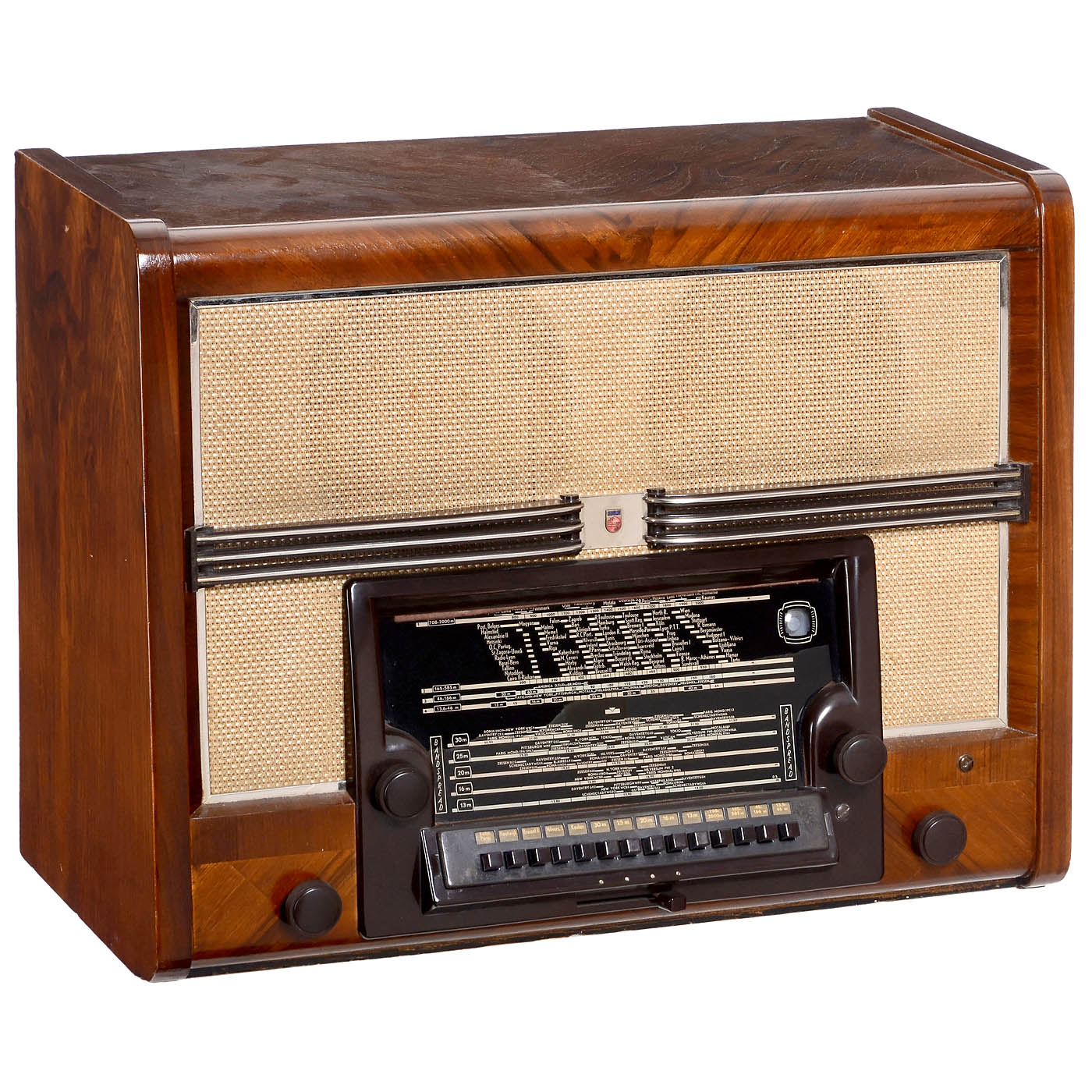 Philips, Eindhoven, Netherlands. 8-tube superhet receiver, long wave, medium wave and twice short wave, 110–245 volts AC, 2 built-in concert speakers, magic eye, 5 preset buttons for all bands, 5 more preset buttons for bands: 30 m, 25 m, 20 m, 16 m and 13 m, 4 buttons for manual tuning in all 4 bands, transmitter tuning with electric motor or manually, well-preserved wood case with original finish. – The top-of-the-range Philips set of the 1940s.