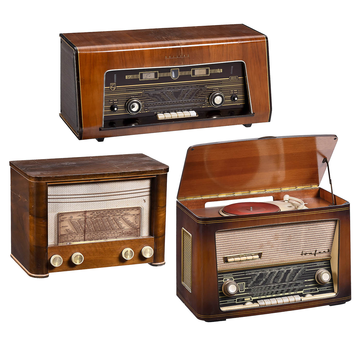 1) "Philips B5X62A", 1956, Philips Netherlands, 9 tubes, 4 wavebands, 110–245 volts AC, 2 built-in speakers, magic eye. – 2) "B&O Mini 509K", 1951, Bang & Olufsen, Denmark, 5 tubes, VHF-prepared, long wave, medium wave, various CW bands, all-current set for 110, 125 and 220 volts, built-in loudspeaker. – And: 3) "Phonoperle 58", 1958, Germany, Tonfunk GmbH, Karlsruhe, built-in Philips record player, 6 tubes, 4 wavebands, 120/220 volts AC, built-in loudspeaker, magic eye. – All radios with tubes and rear panels.