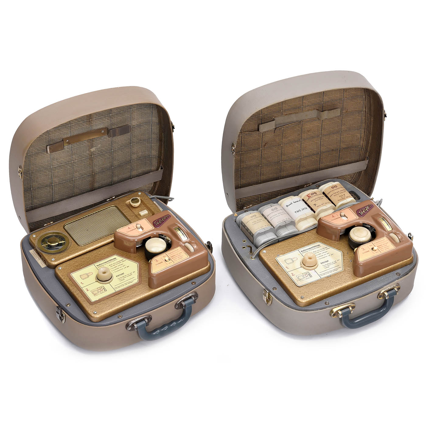 Tefi-Apparatebau, Porz near Cologne. 1) 2 suitcase players KC1/Ko, working. – 2) Suitcase player with medium wave radio KC-1/KoII (KC-1/Ko2), working. –3) Sound tape player KC-4, working. – 4) Sound tape player KC-1/Ra, with remote control, untested. – And: 5) 66 sound tapes, including two 4-hour cassettes.