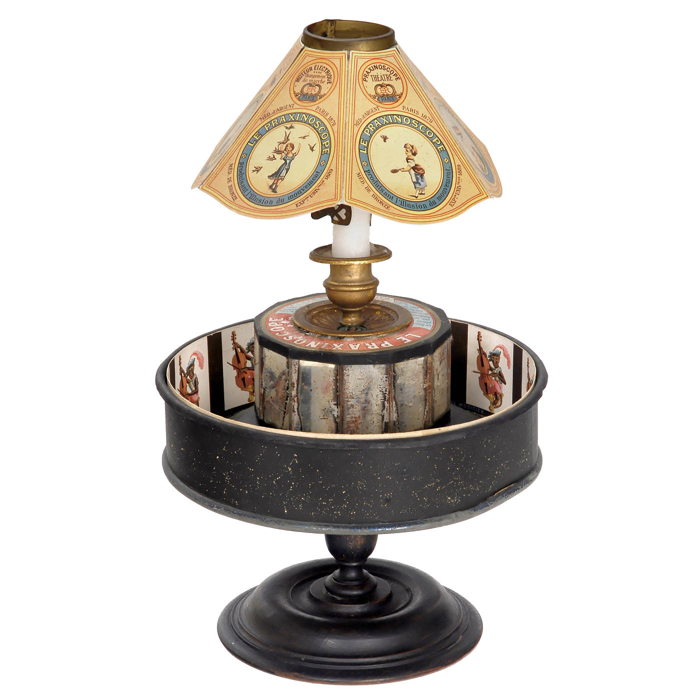 E. Reynaud, Rue Rodier, Paris. Model from 1889, with replica shade, candle-holder, original mirrors and 8 original strips (one strip with minor damage). A very important and early pre-cinema collector's item! – Note: An improvement of the zoetrope, Émile Reynaud's praxinoscope used a series mirrors with prism-like effect to create moving images without the typical 'flicker' associated with 'persistence of vision' devices. – Literature: Coe, "The History of Movie Photography", p. 35.
