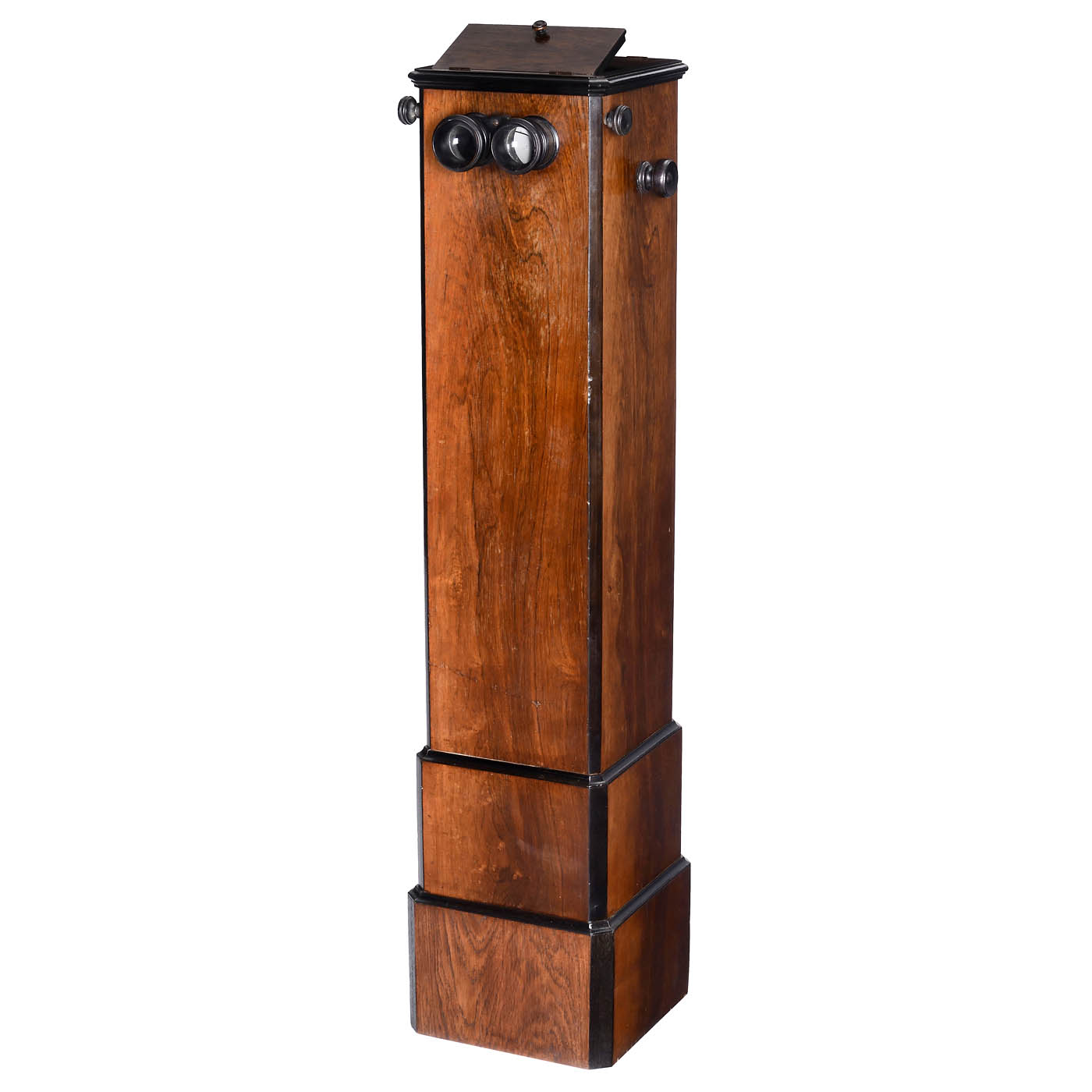 France, for 200 stereo slides/cards of 9 x 18 cm, veneered case with canted corners, transport mechanism works well, only occasionally a little help is needed, with mirror flap and large focusable focusing eyepieces, ht. 122 cm, veneer on left side slightly rippled, otherwise in good condition.