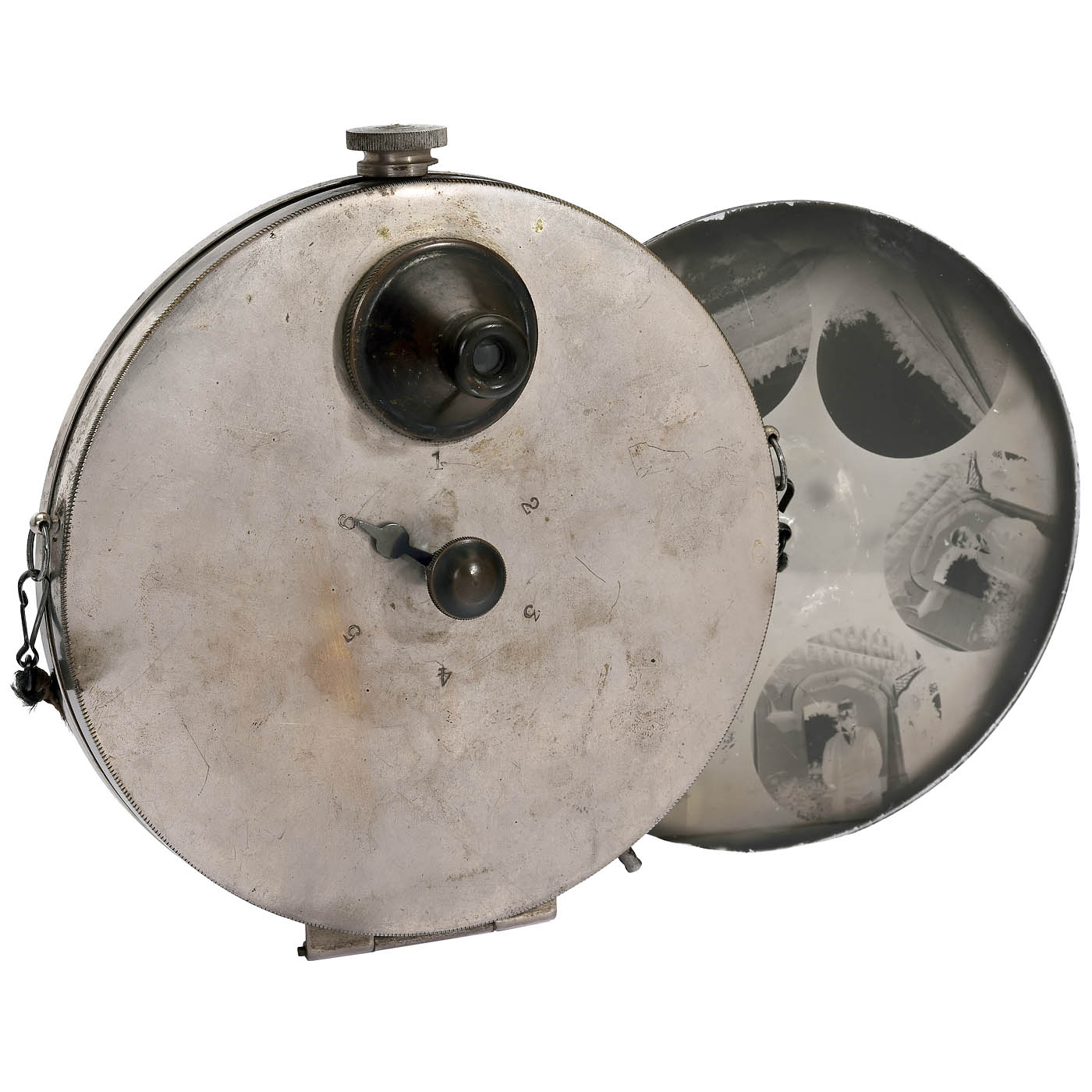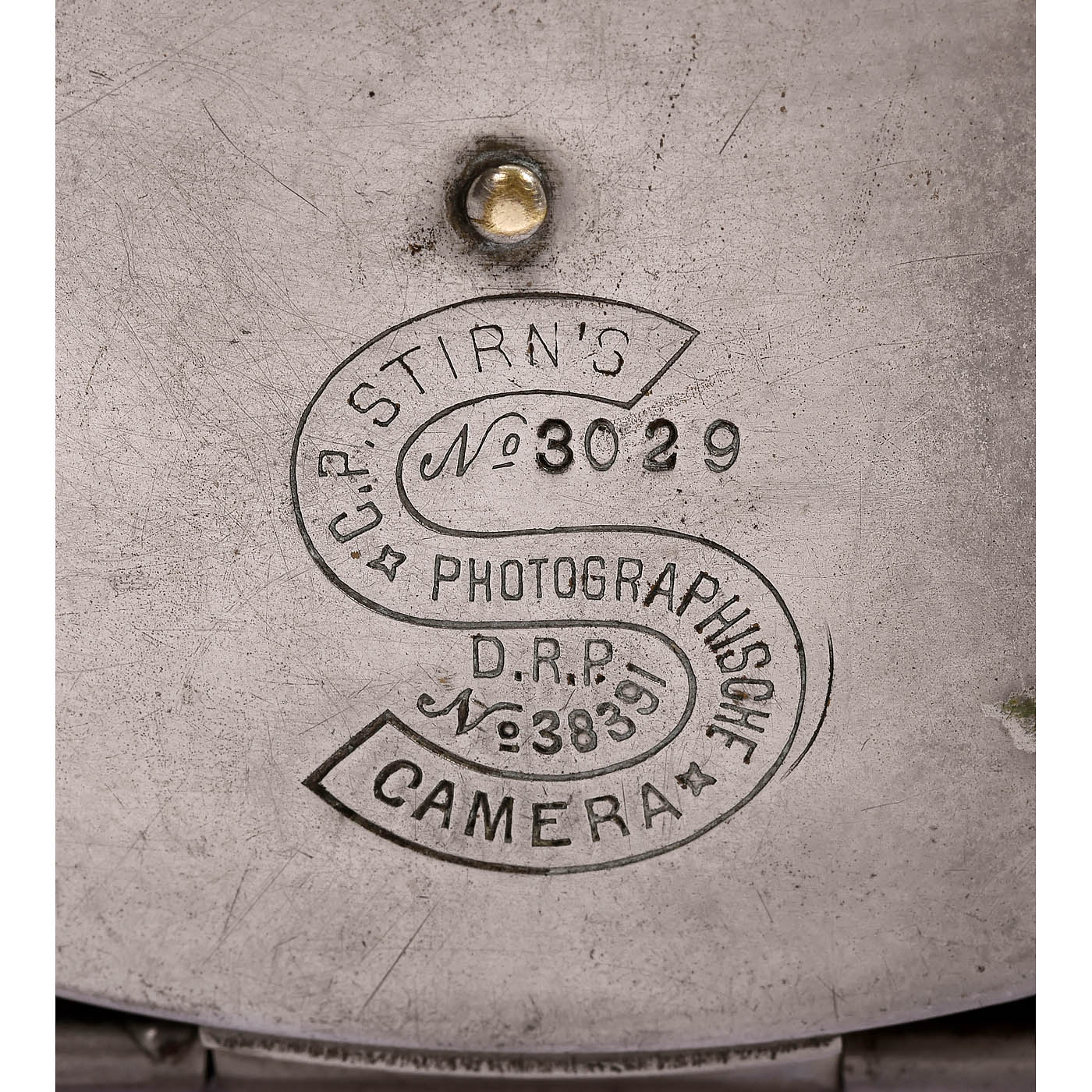 C.P. Stirn, Berlin, No. 3029, nickel-plated version, for 6 exposures of 4.1 cm, with periscope lens, guillotine shutter (sticking), aluminum locking mechanism and extremely rare original exposed plate, camera diameter 14.8 cm.
